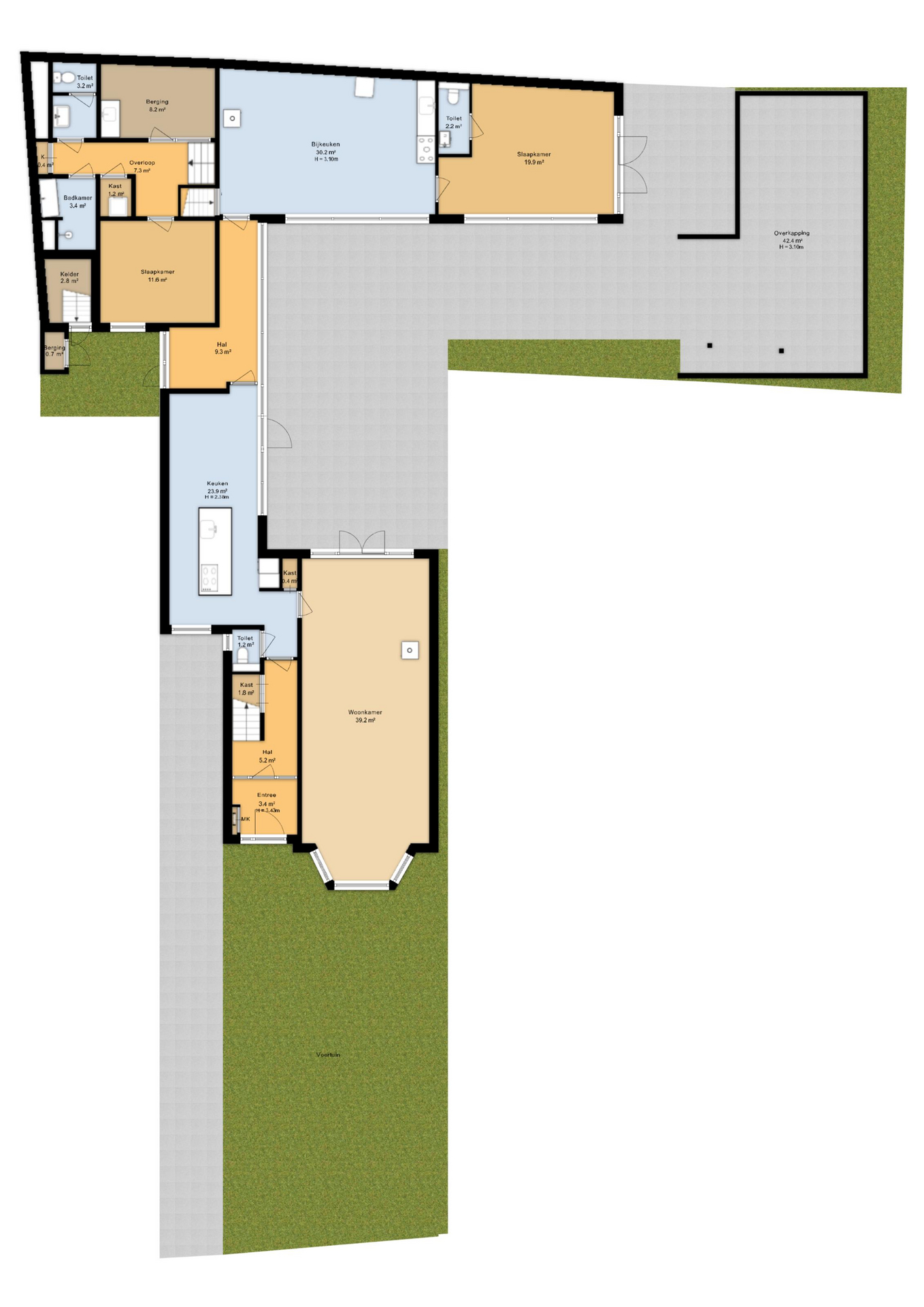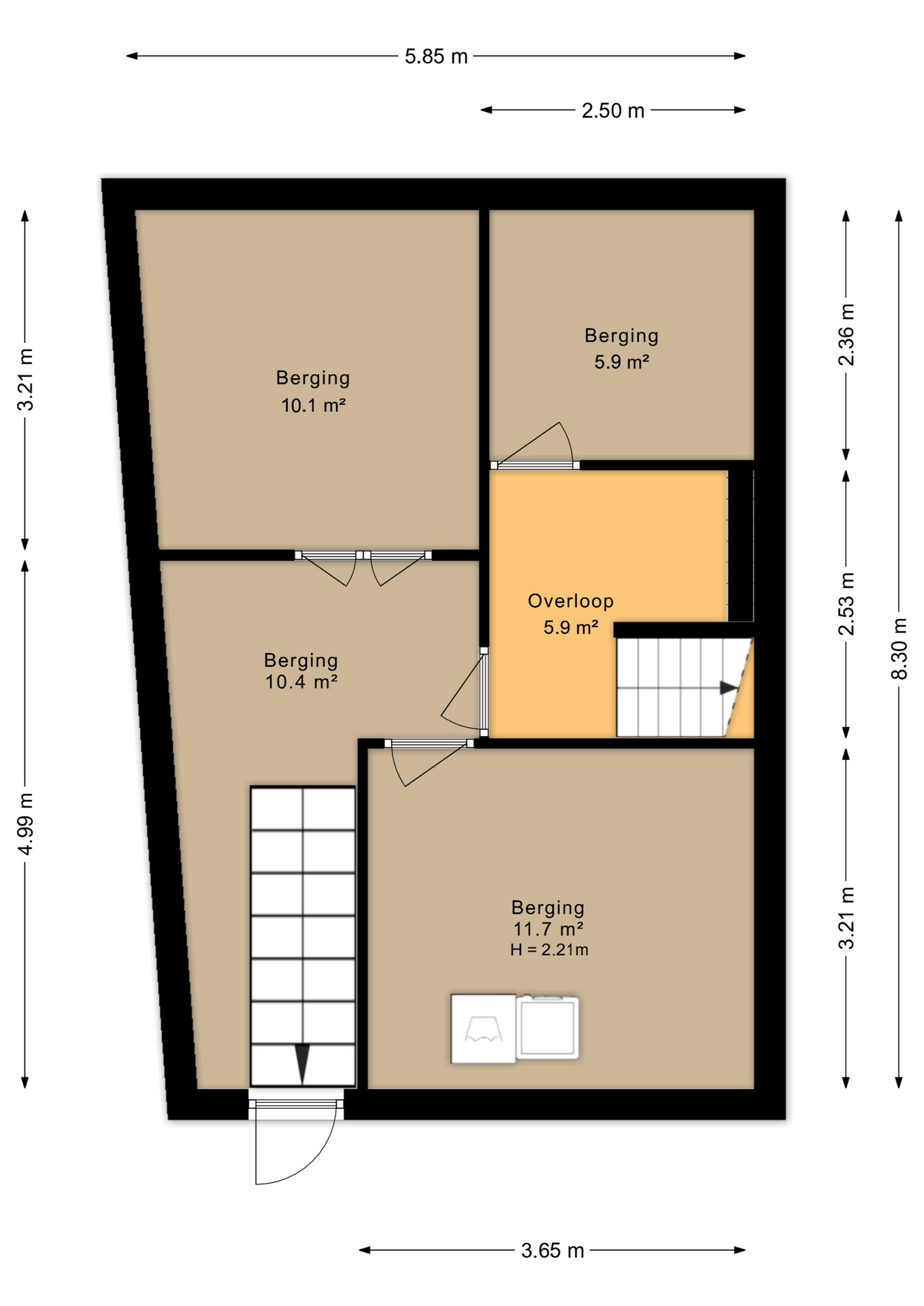 – Ruime kelder op stahoogte met 3 ruime vertrekken, inclusief ruimte voor de fietsen, drie ruime ruimtes, verwarmd. Nu als opslag, klusruimte en wasruimte in gebruik.