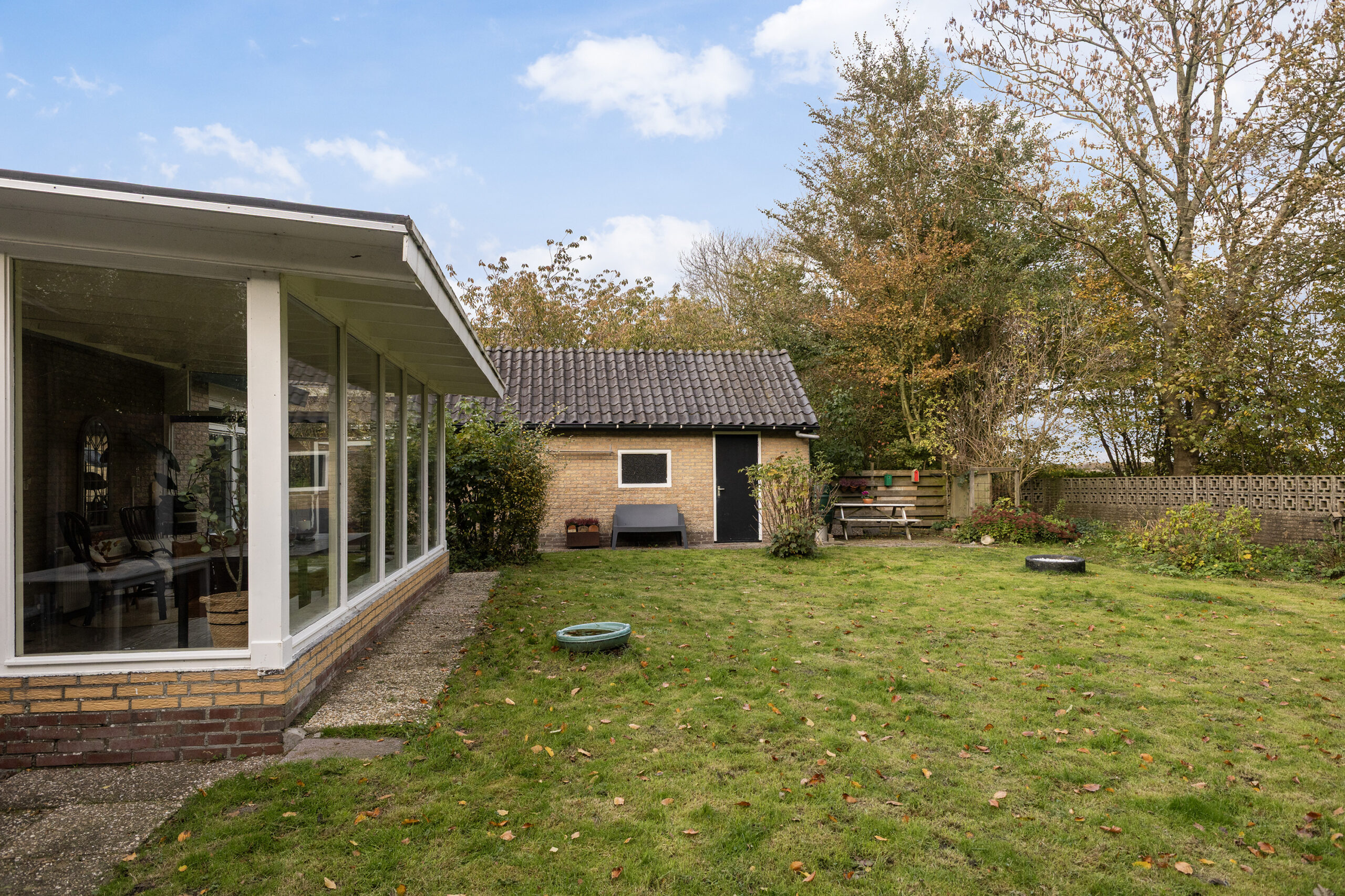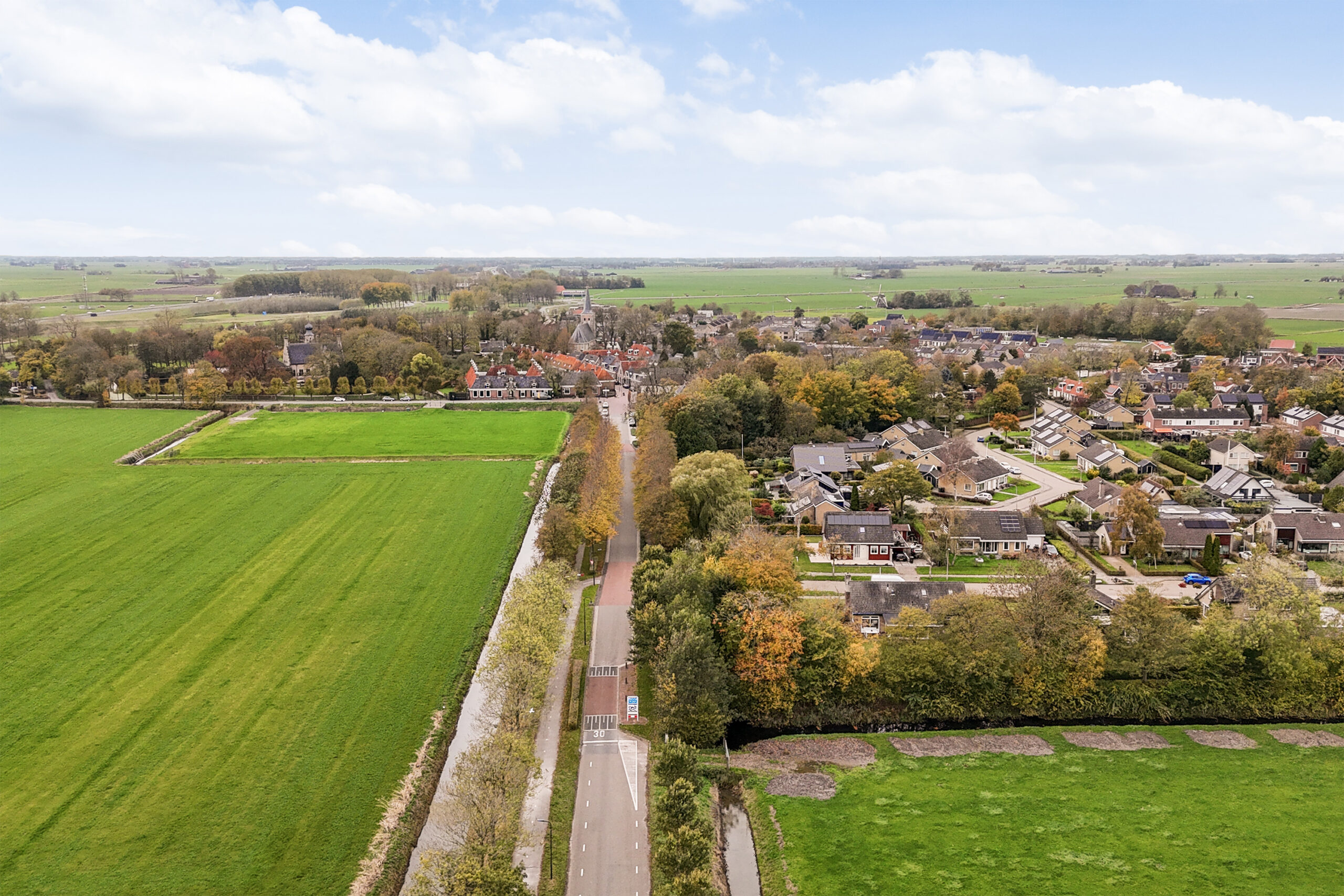 De royale tuin ligt rondom, er is een achterom en links van de woning staat een vrijstaande stenen garage. Het perceel wordt omheind door een mooie grote bomenwal, waardoor er veel privacy wordt ervaren in de tuin. Achter de bomenwal liggen de landerijen tussen Marsum en Leeuwarden.