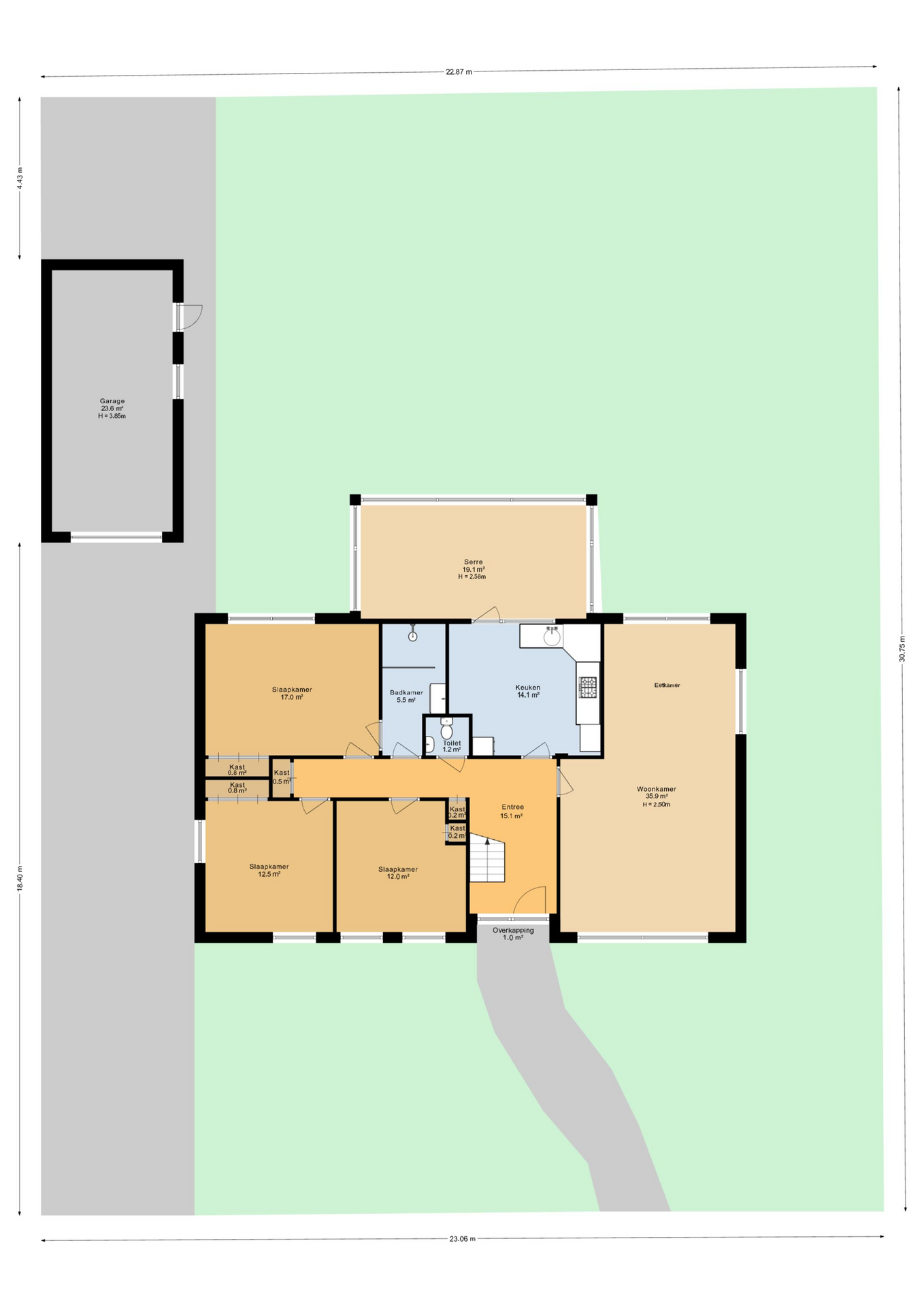 – zéér royale tuin rondom met achterom en een vrijstaande stenen garage