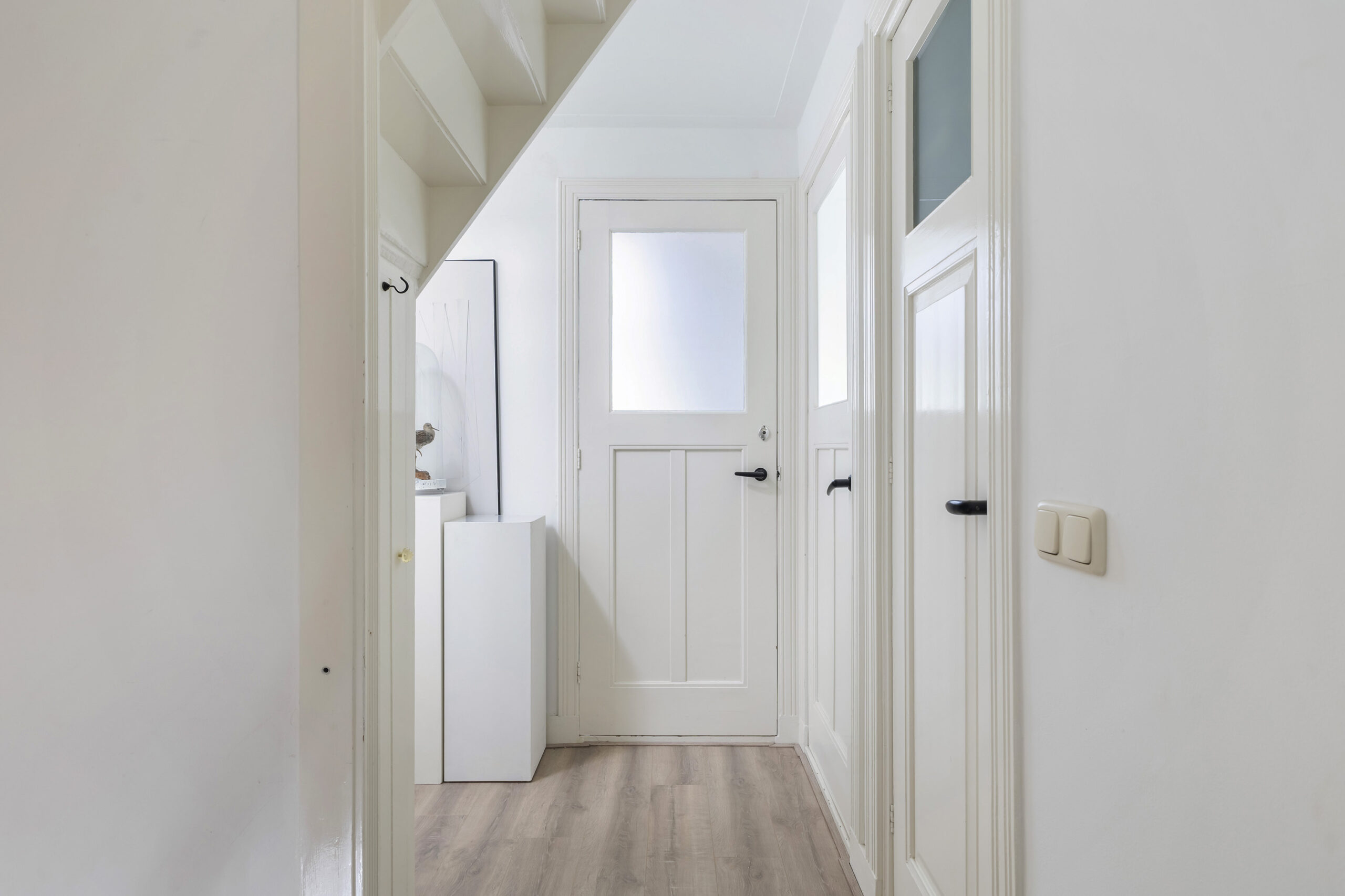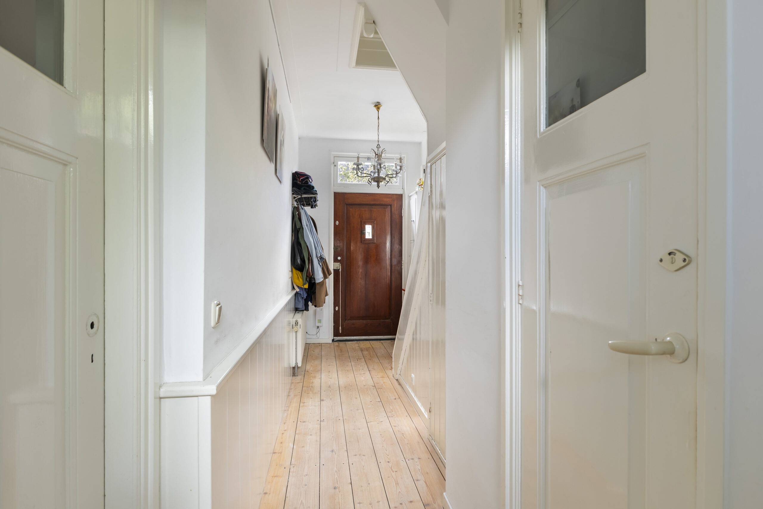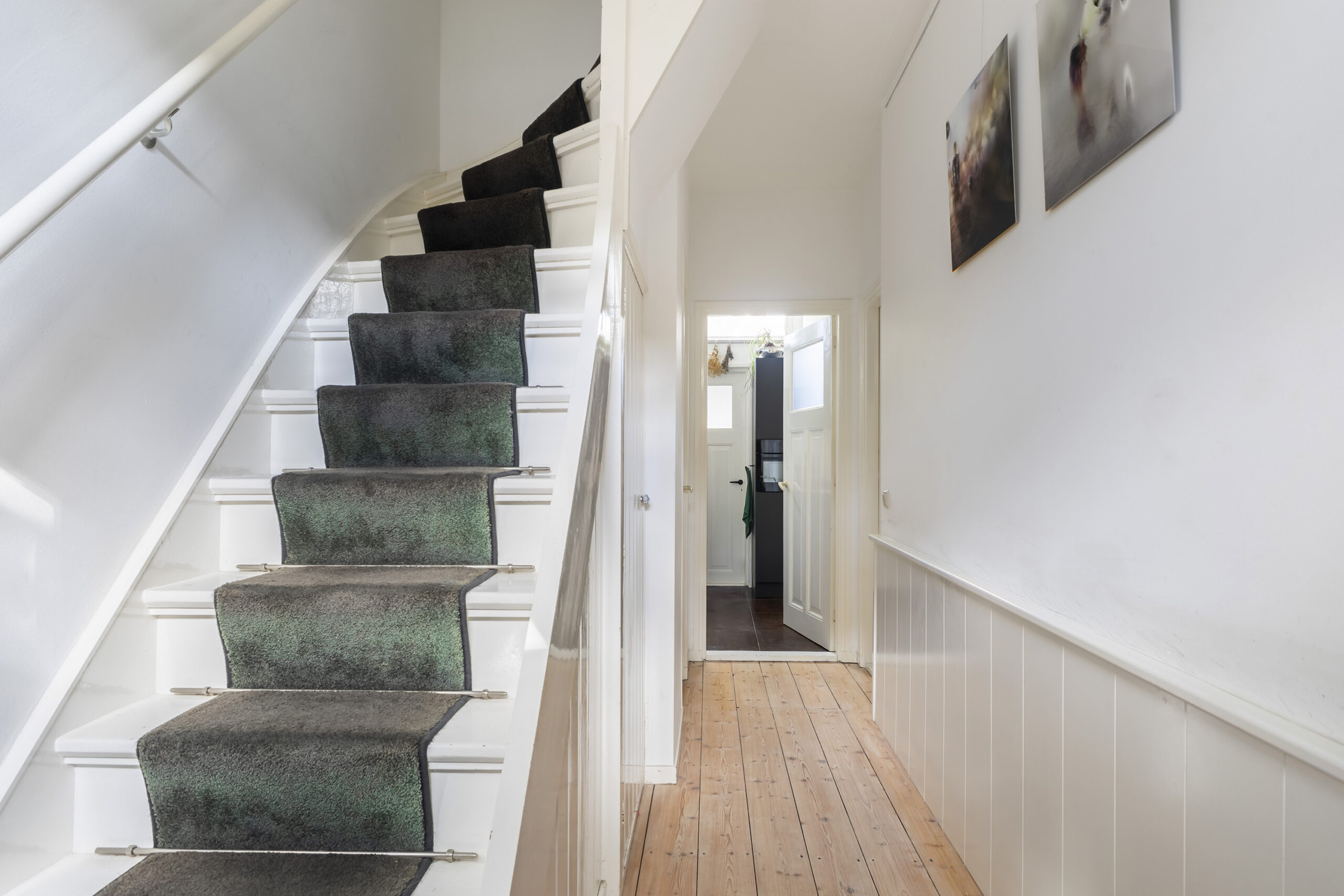 Via de circa 4 meter diepe voortuin wordt de entree van de woning bereikt. In de ruime hal, met trapopgang naar de eerste verdieping, bevindt zich het moderne toilet met een hangend closet en fonteintje. In de kelder onder de trap bevindt zich de waterontharder (ter overname).