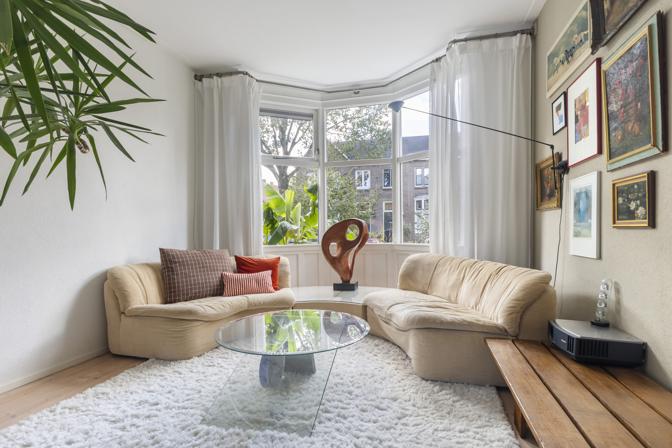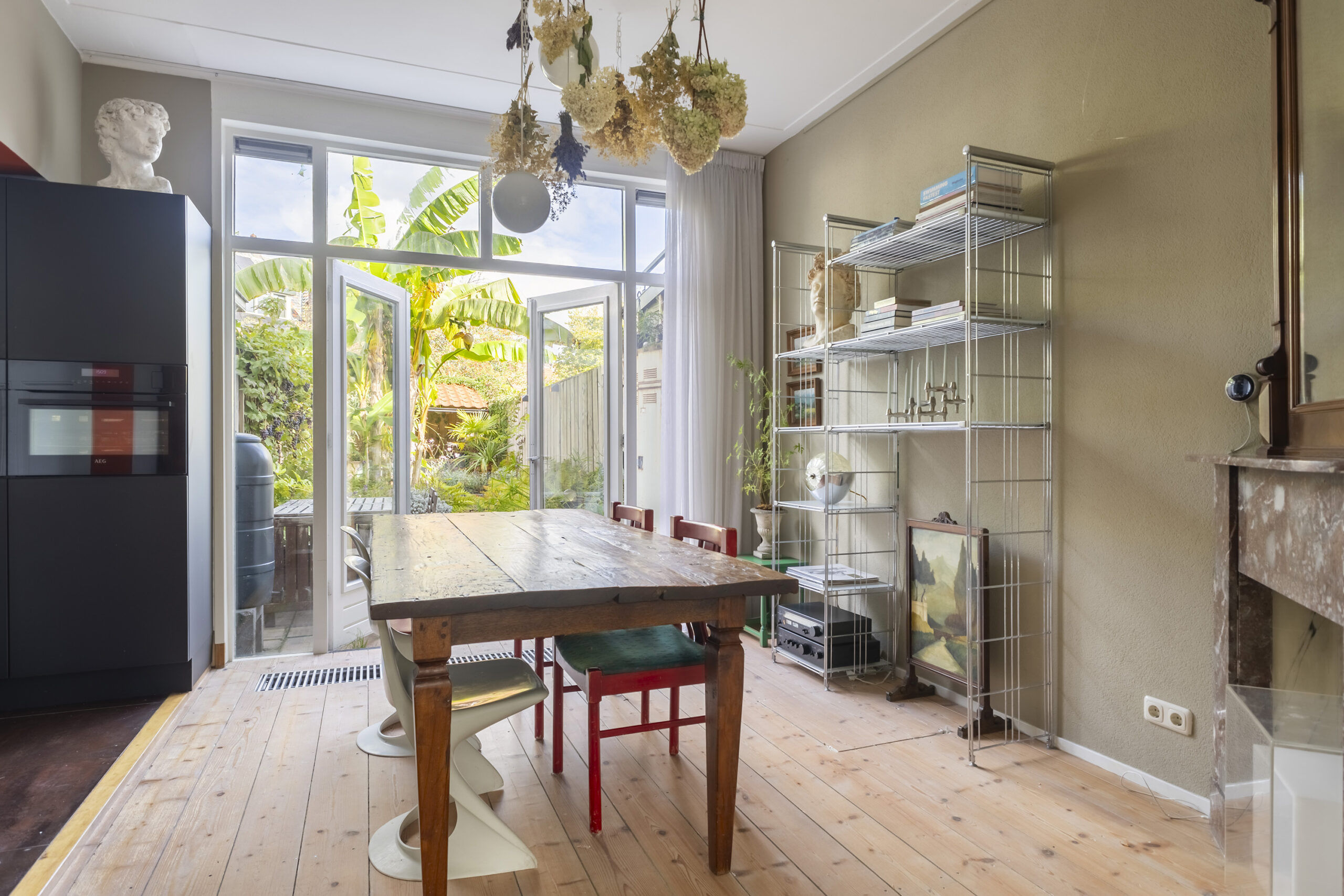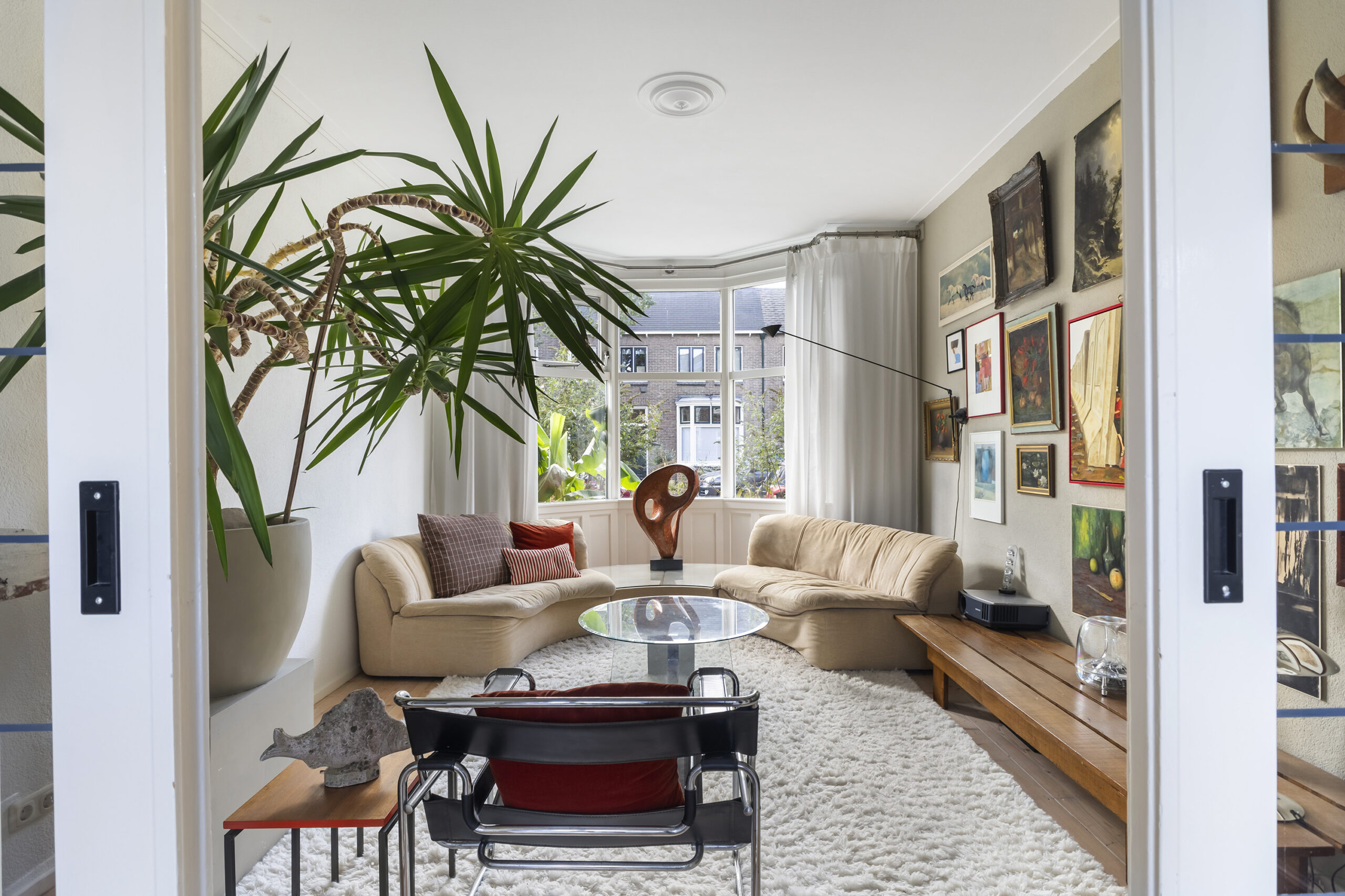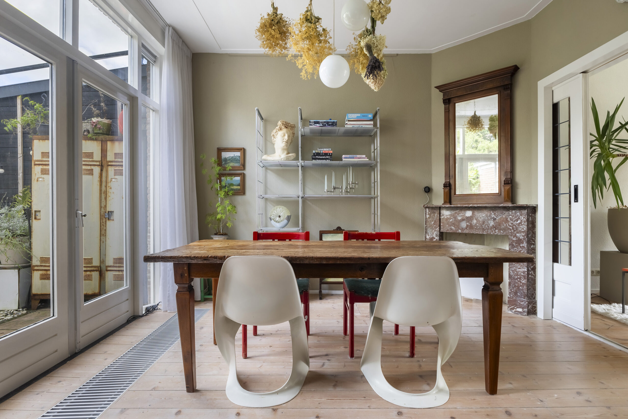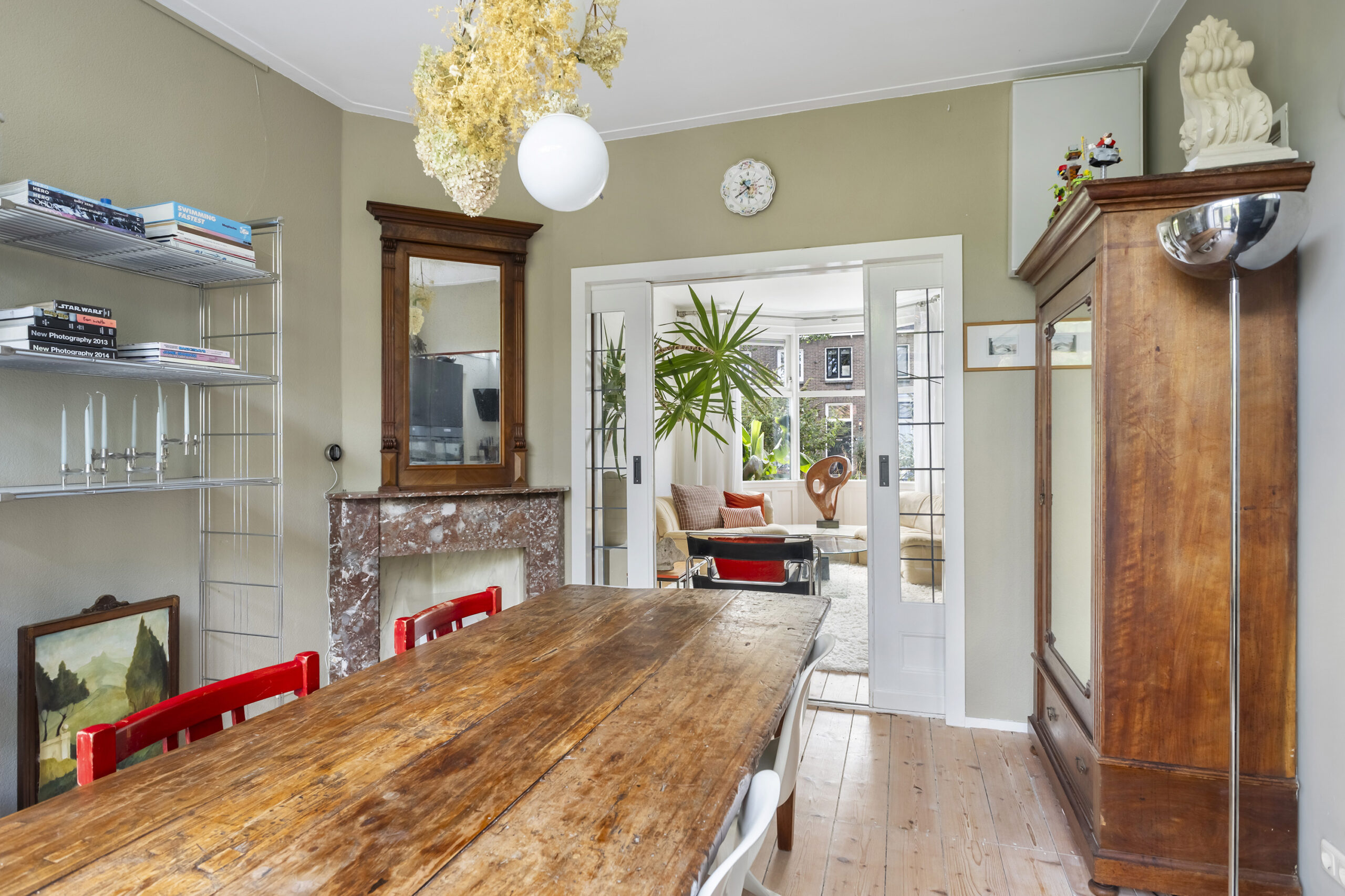 De sfeervolle woonkamer en-suite beschikt over de originele erker en marmeren schouwen, wat zorgt voor een authentieke uitstraling. Aan de achterzijde geven openslaande deuren toegang tot de tuin, waardoor er veel licht en een prettige verbinding met buiten ontstaat.