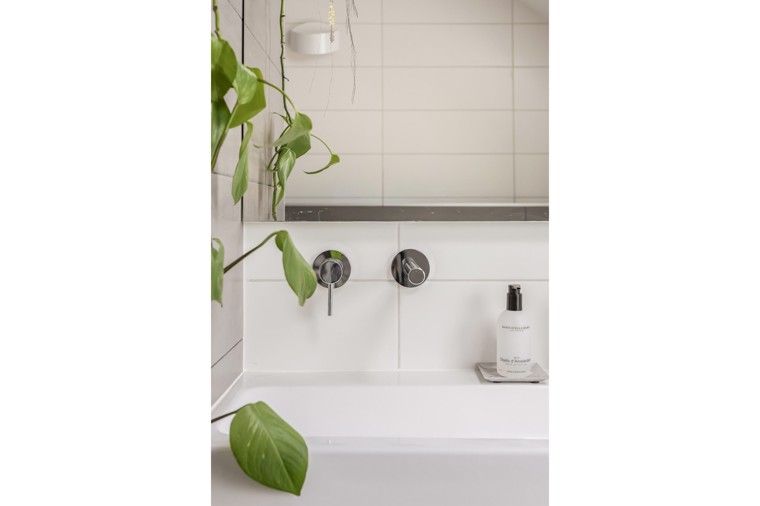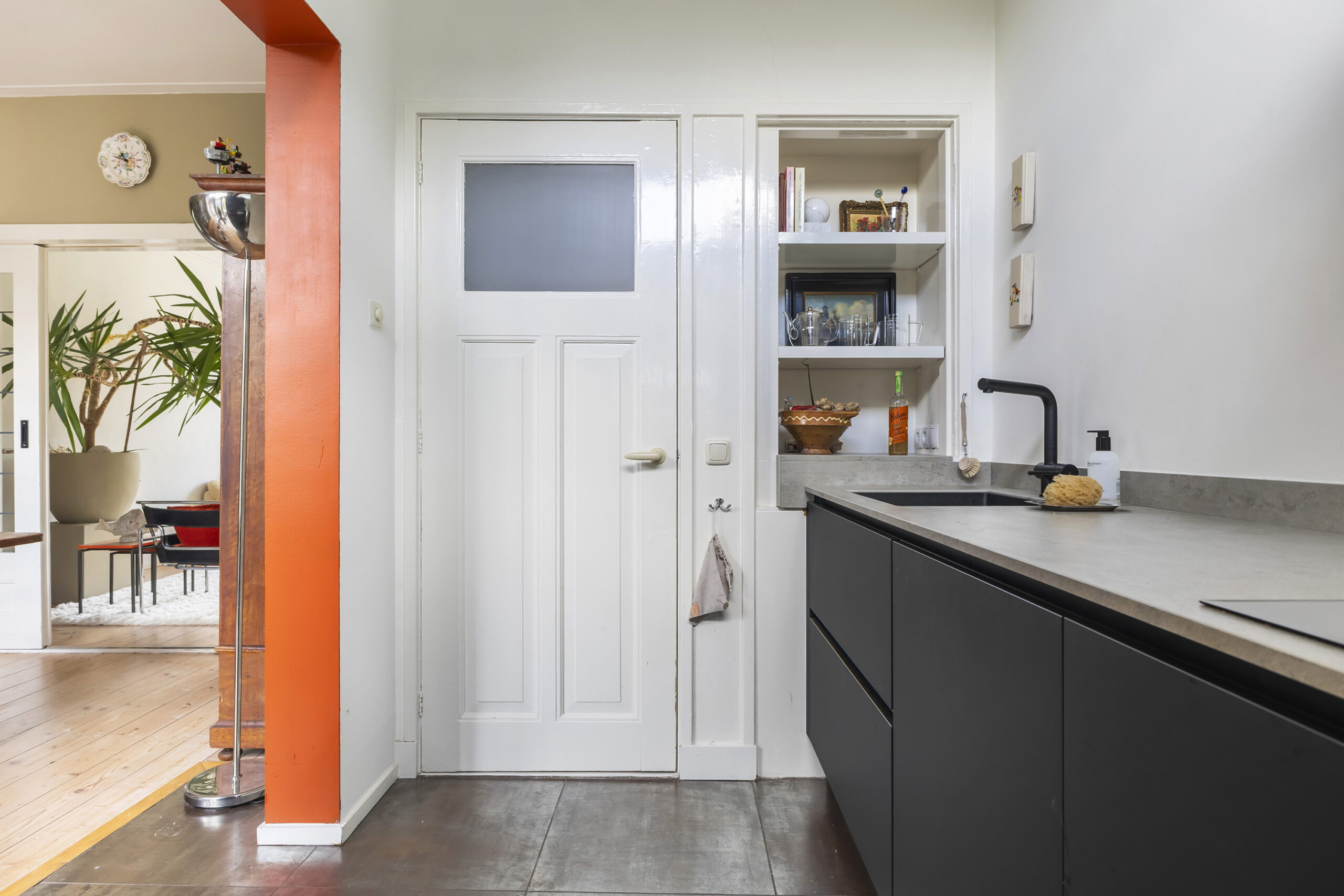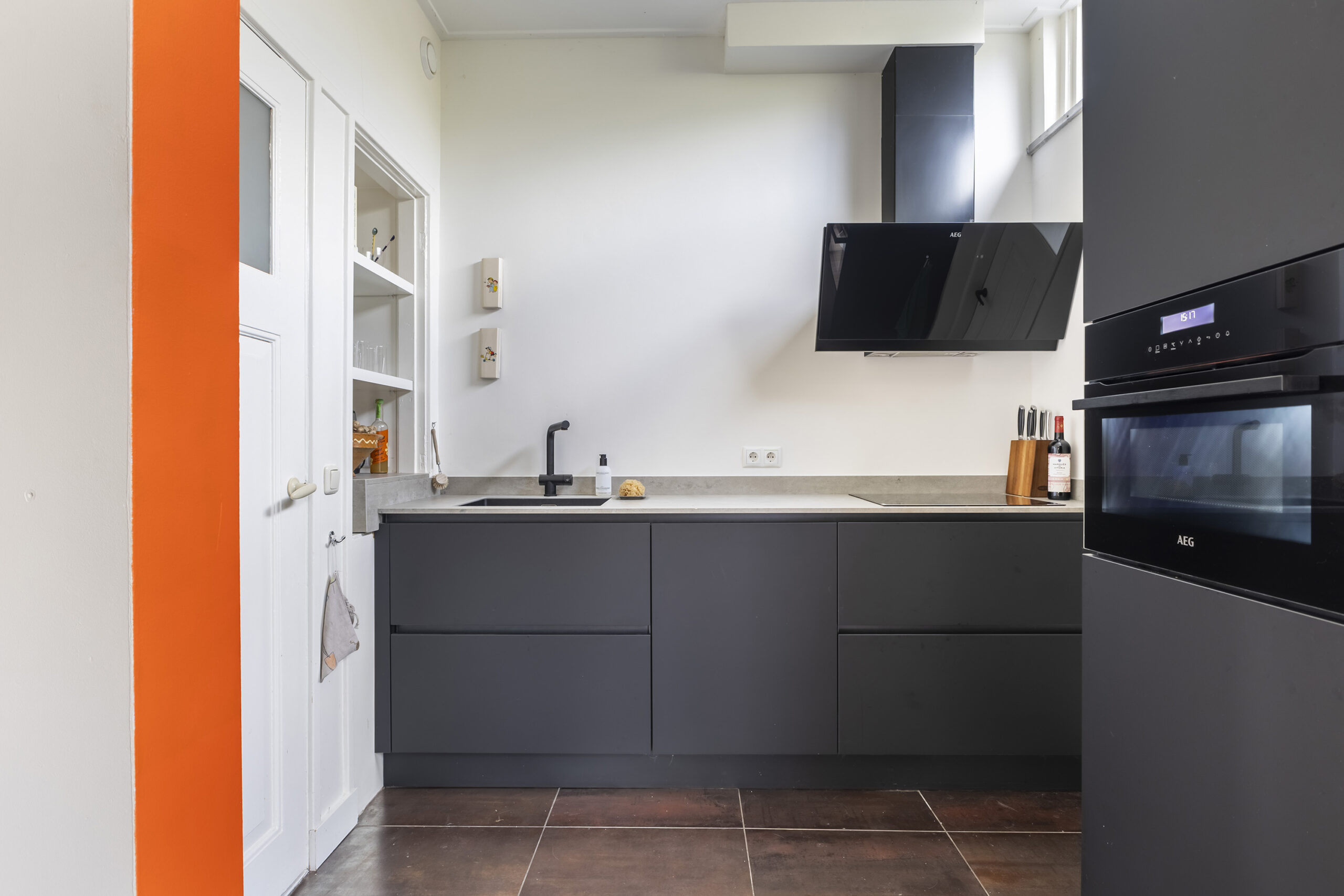 De half open keuken in wandopstelling heeft een natuurstenen werkblad en is uitgerust met diverse inbouwapparatuur van AEG, waaronder een stoomoven, combi-oven, vaatwasser en inductiekookplaat. Aansluitend bevindt zich de bijkeuken, met de opstelling van de cv-installatie en een deur naar de tuin.