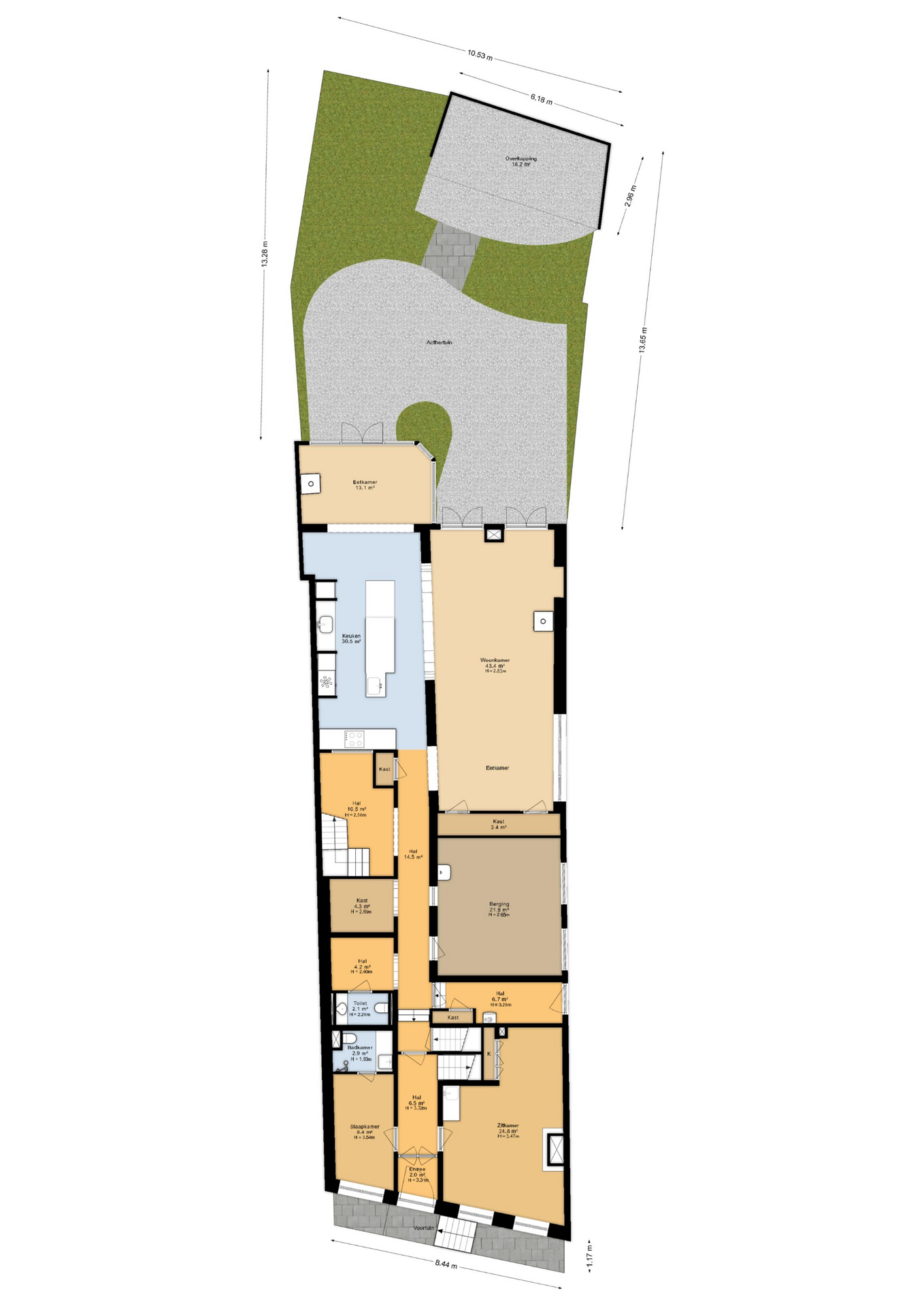 3 woningen: huisnummer 36: circa 361 m², huisnummer 36A: circa 55 m² en huisnummer 36B: circa 77 m²