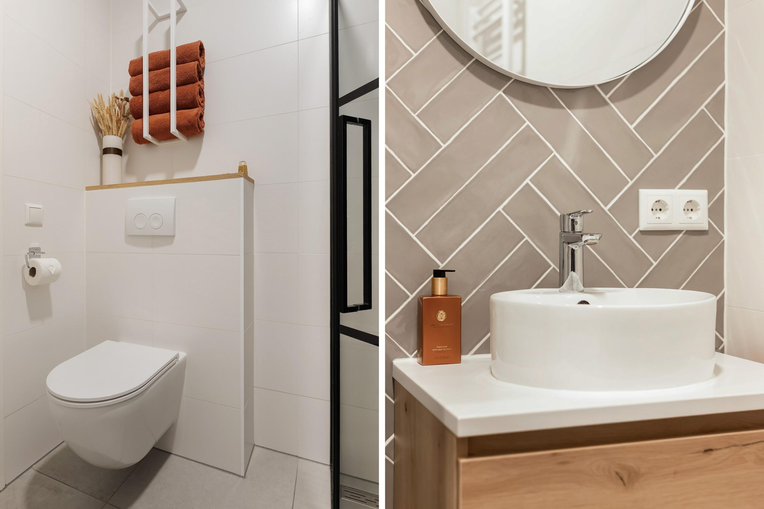 – moderne badkamer met douche, wastafelmeubel en toilet