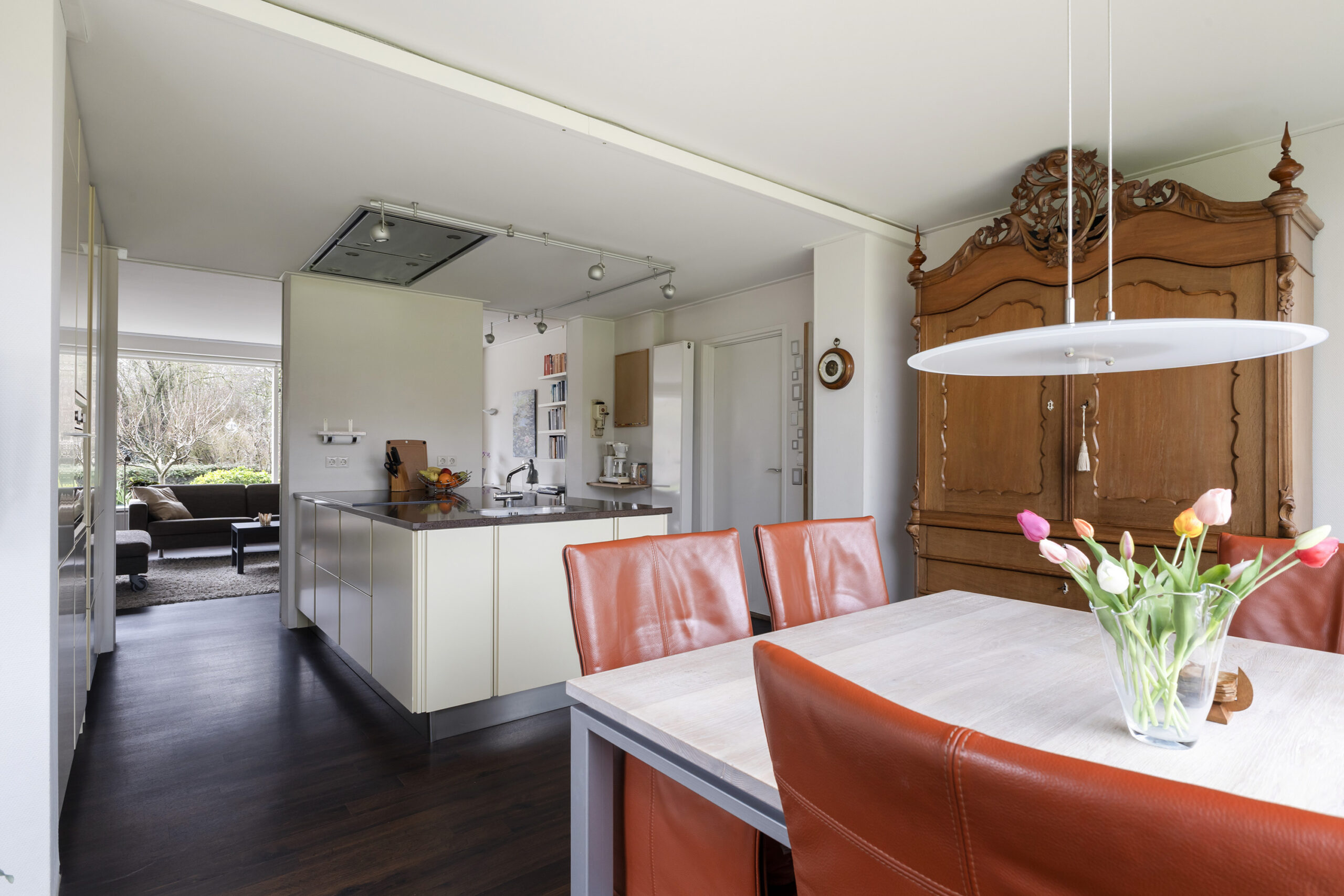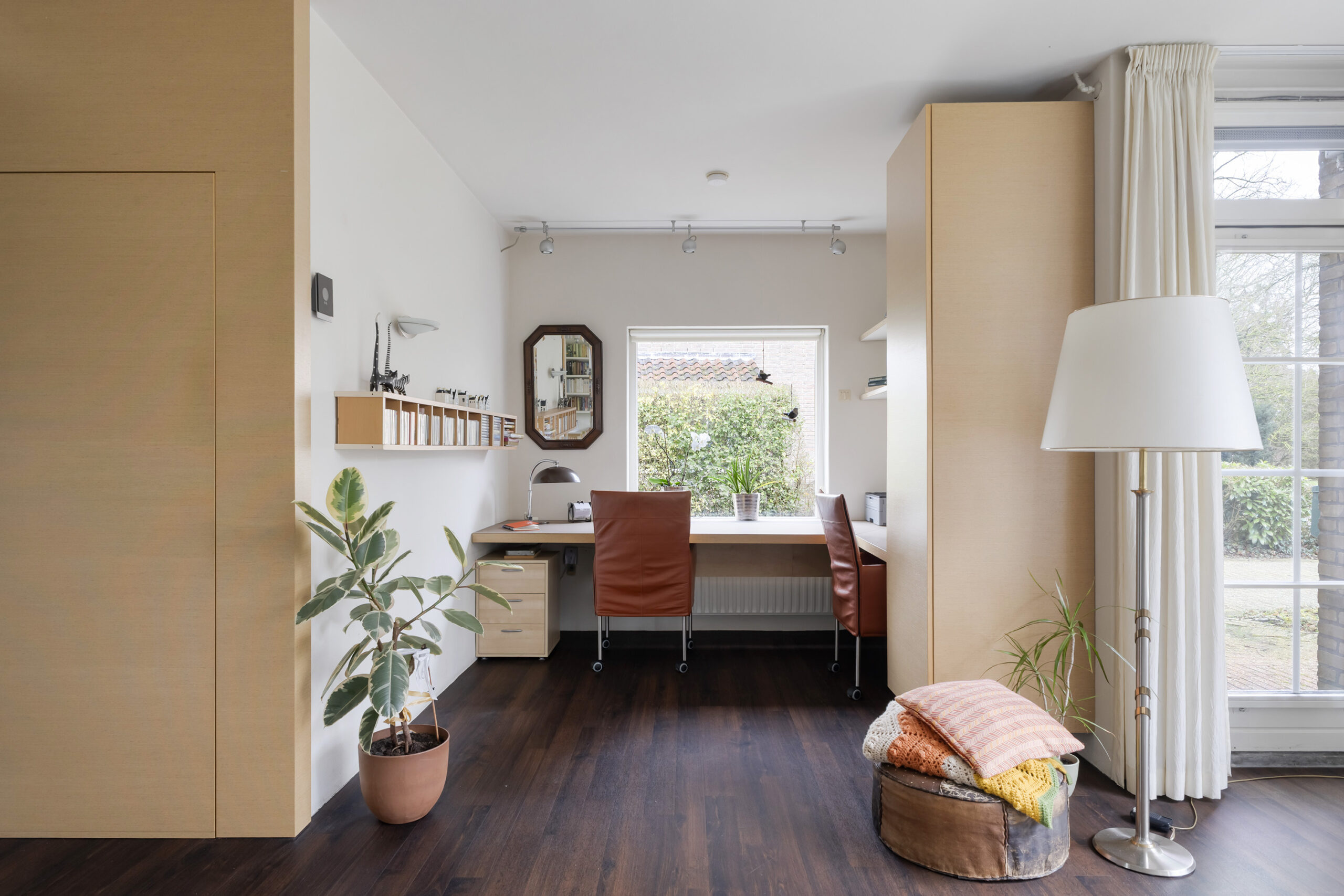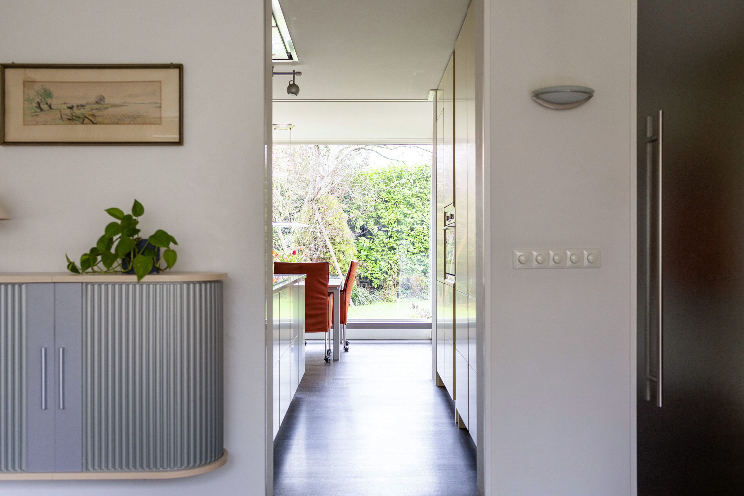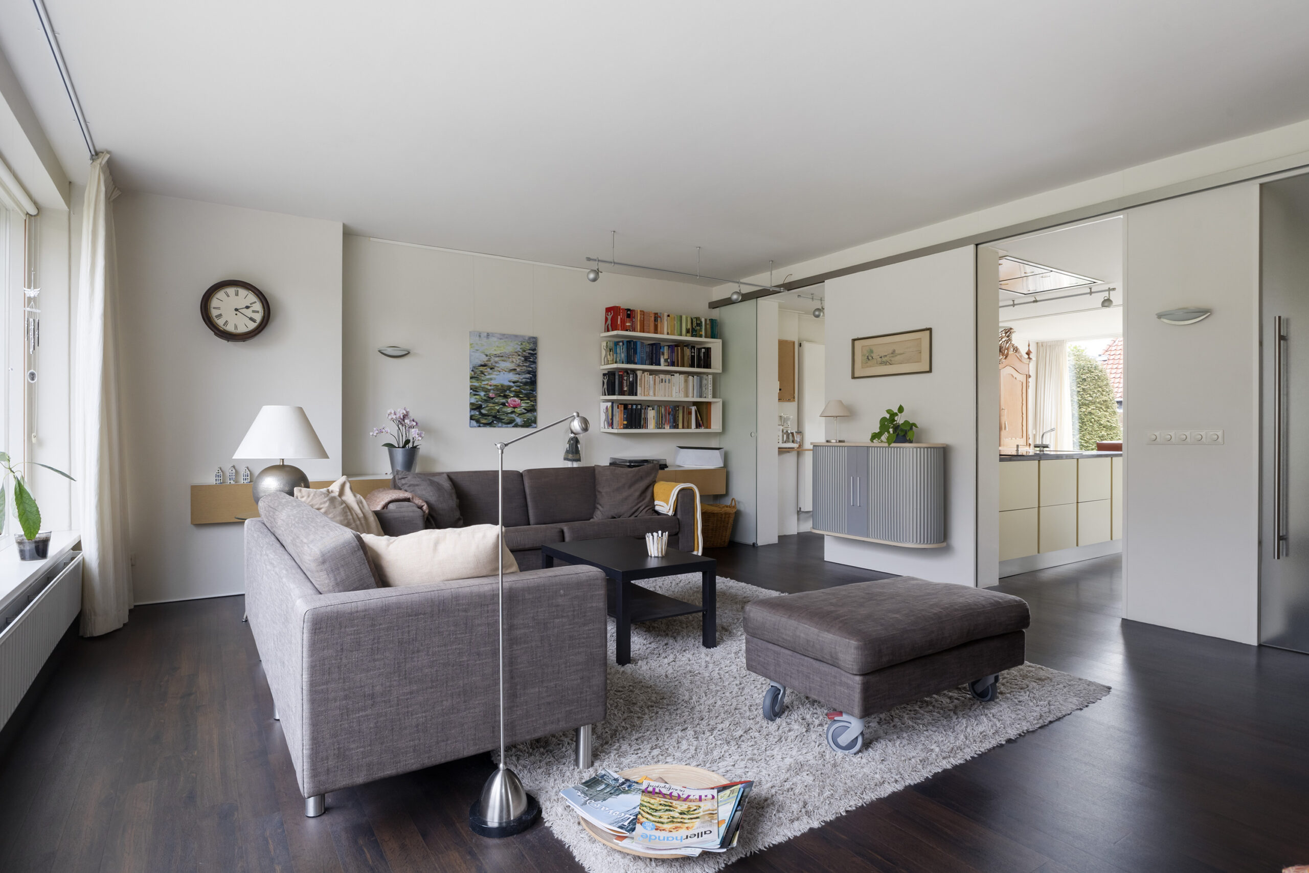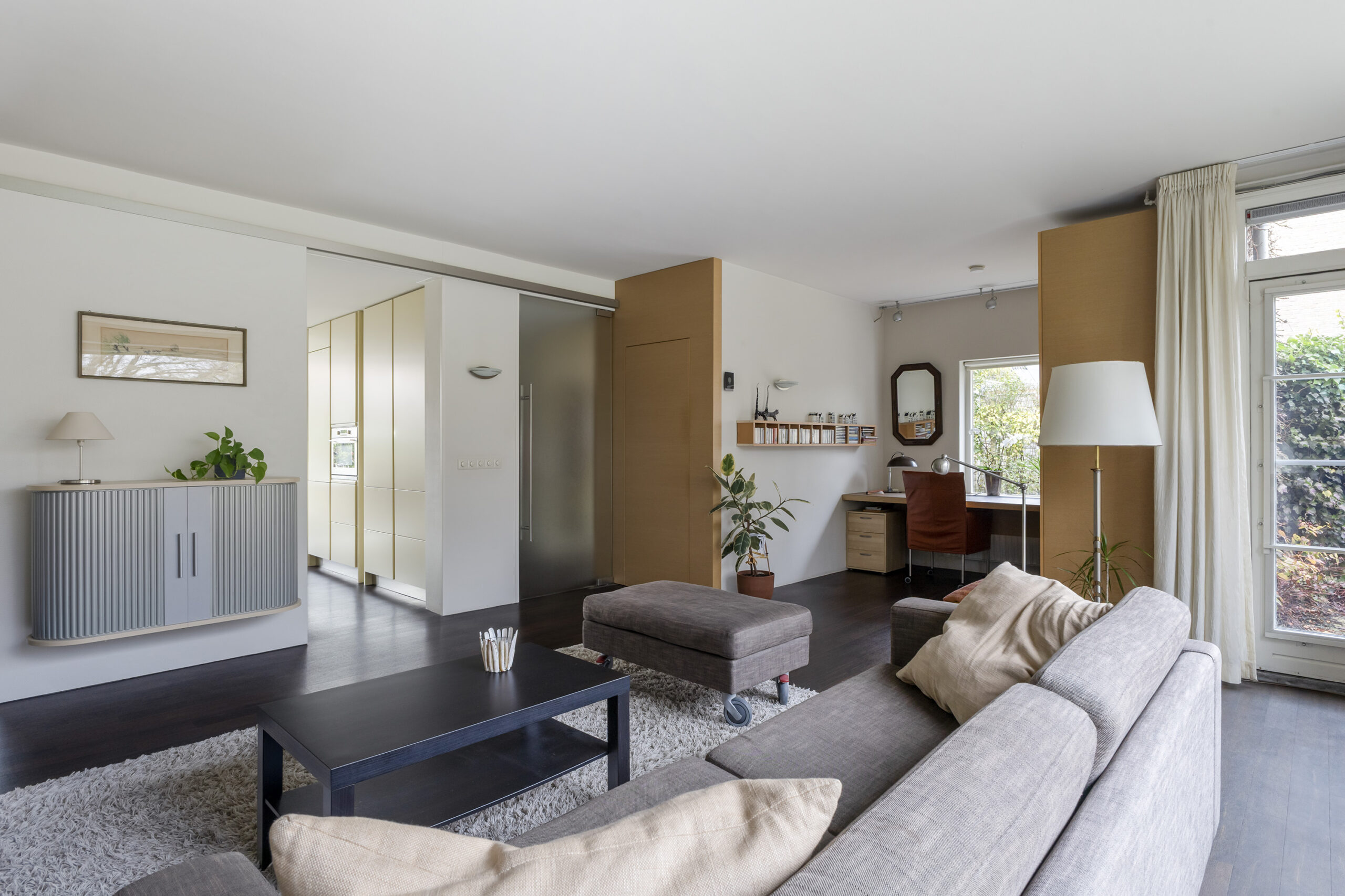 – ruime en speels ingedeelde woonkamer met werkhoek, loopdeur naar de voortuin/oprit en een open verbinding met de keuken/tuinkamer met loopdeur naar de achtertuin