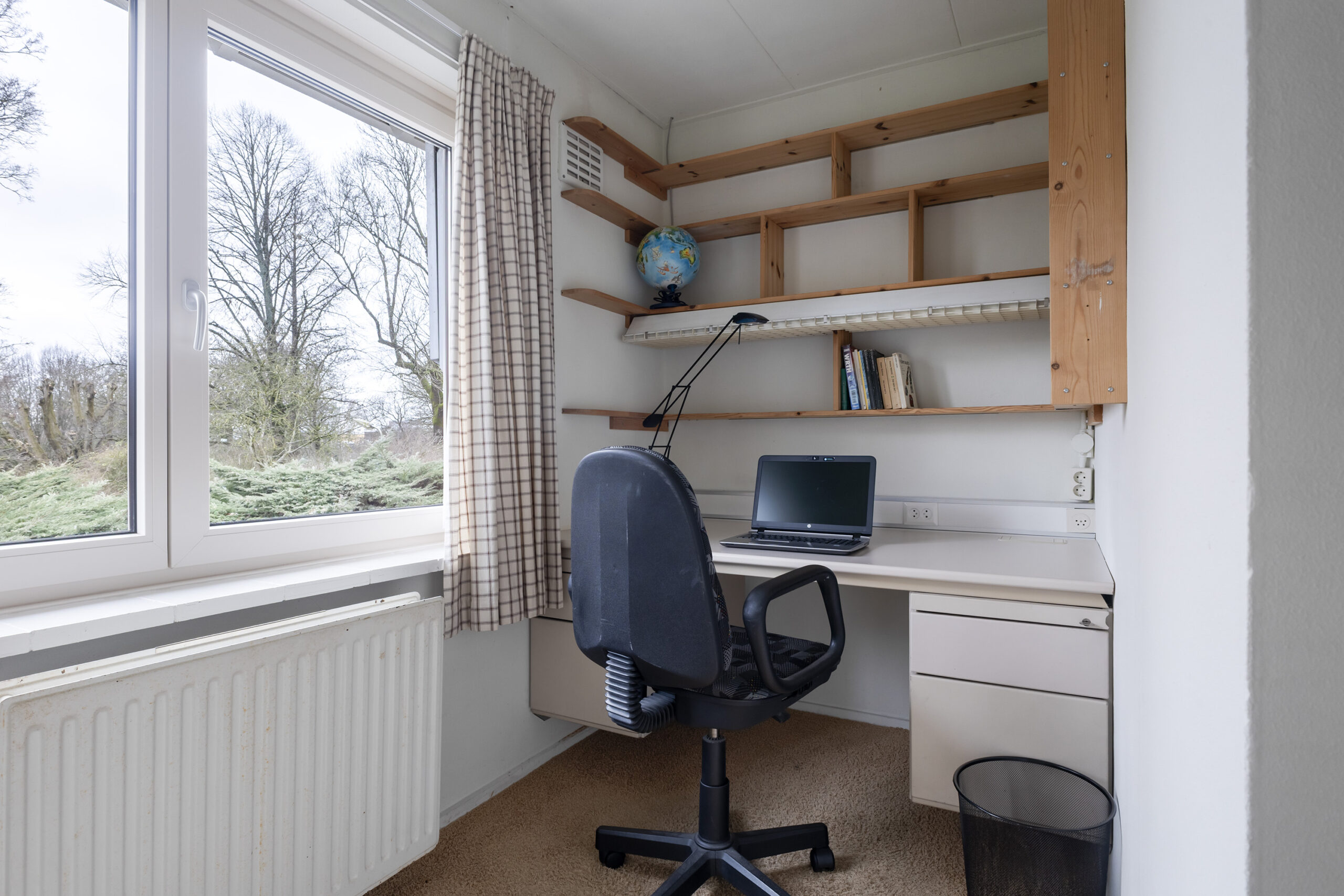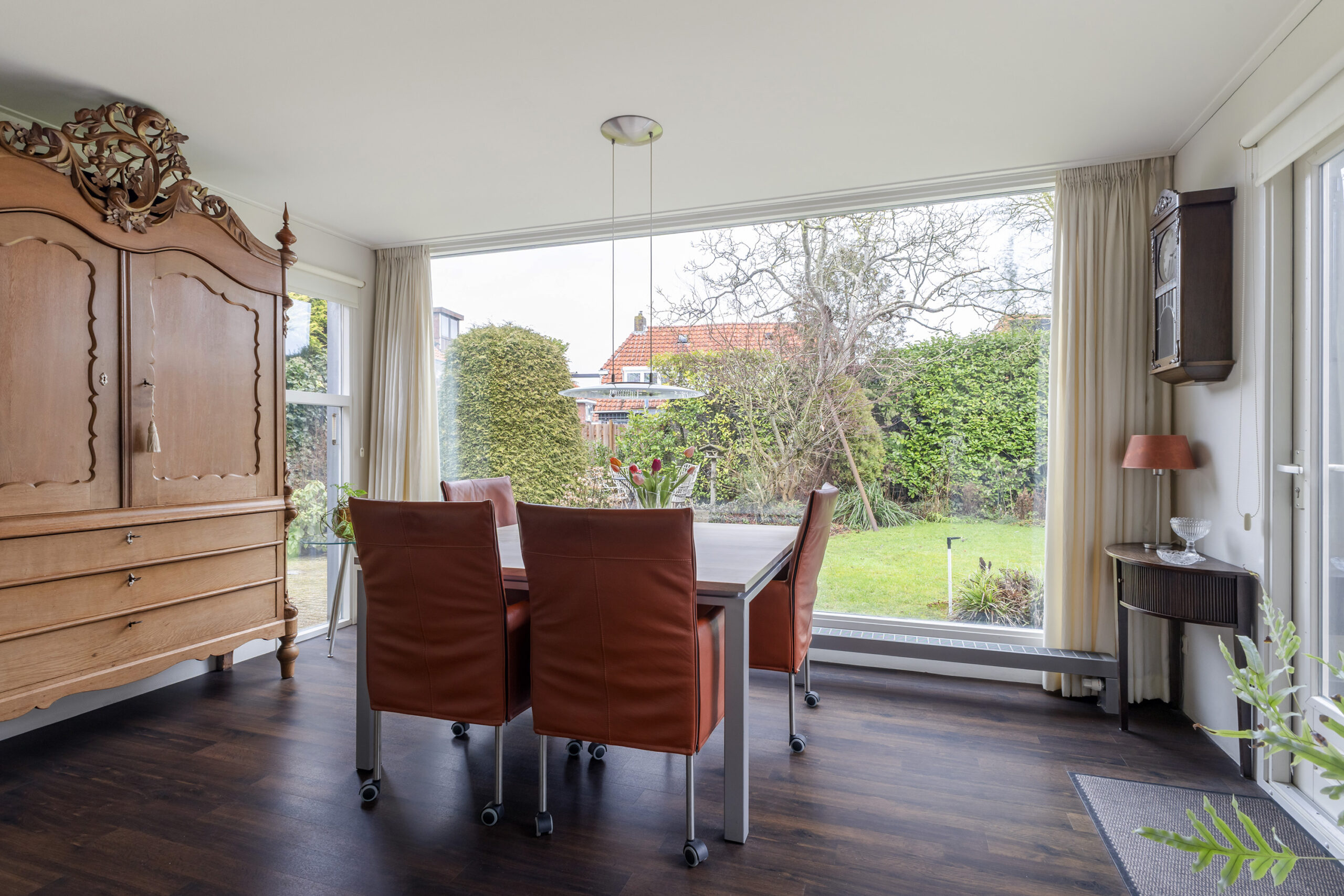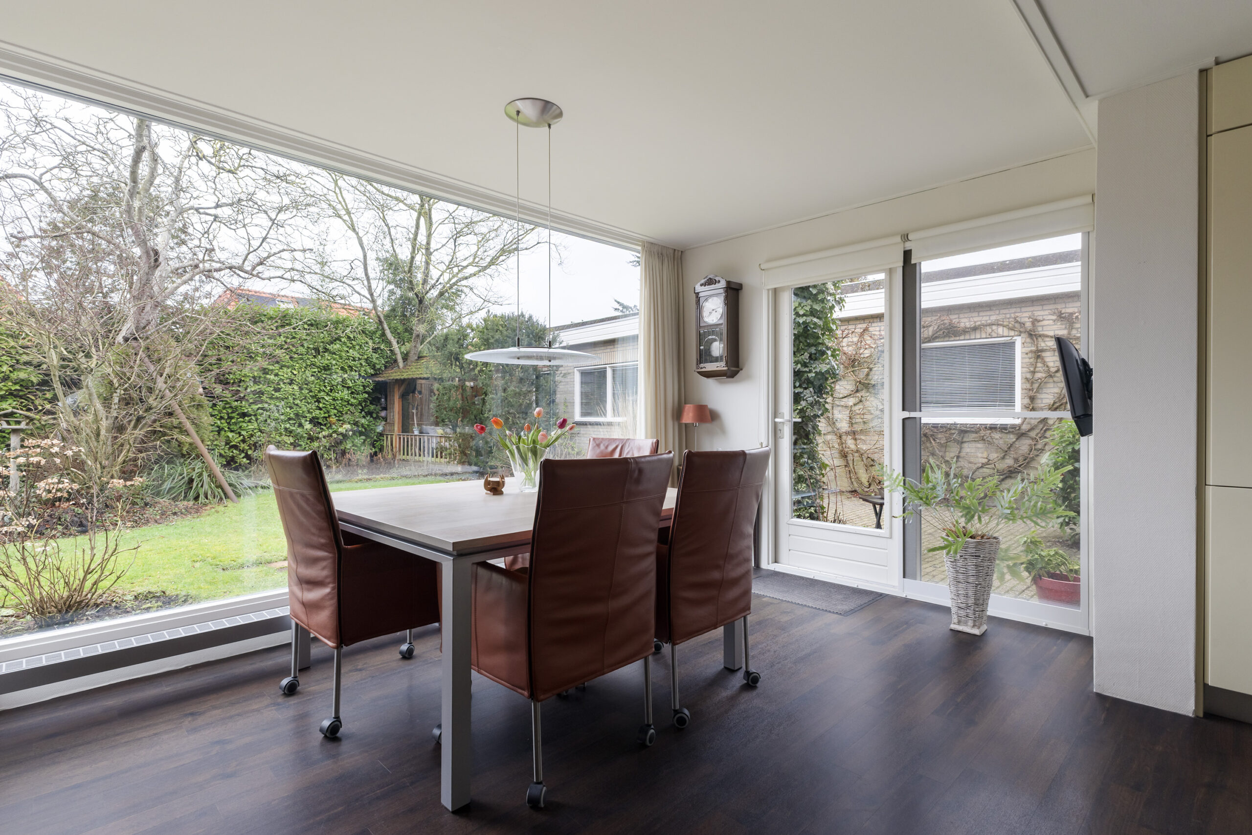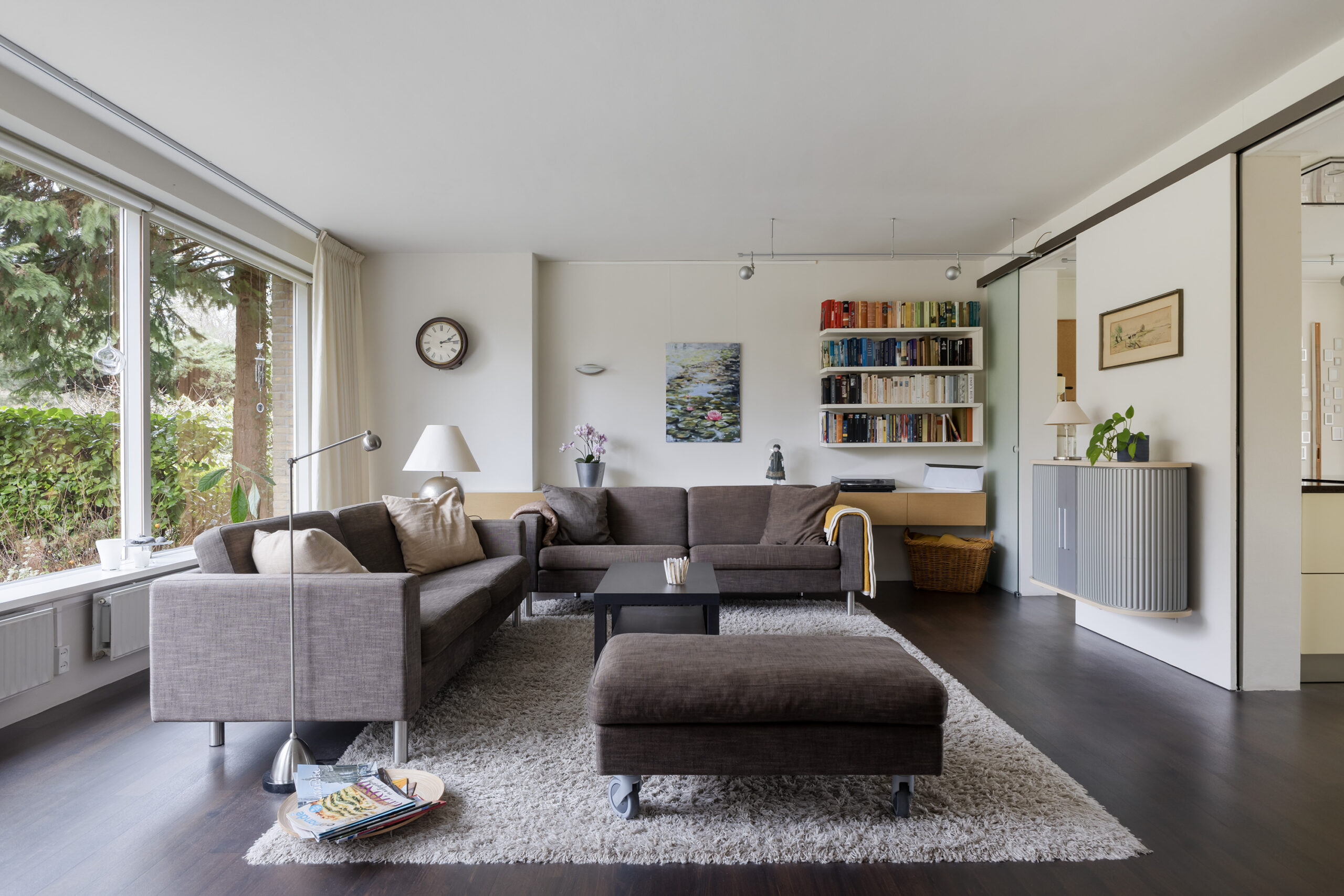 – ruime en speels ingedeelde woonkamer met werkhoek, loopdeur naar de voortuin/oprit en een open verbinding met de keuken/tuinkamer met loopdeur naar de achtertuin