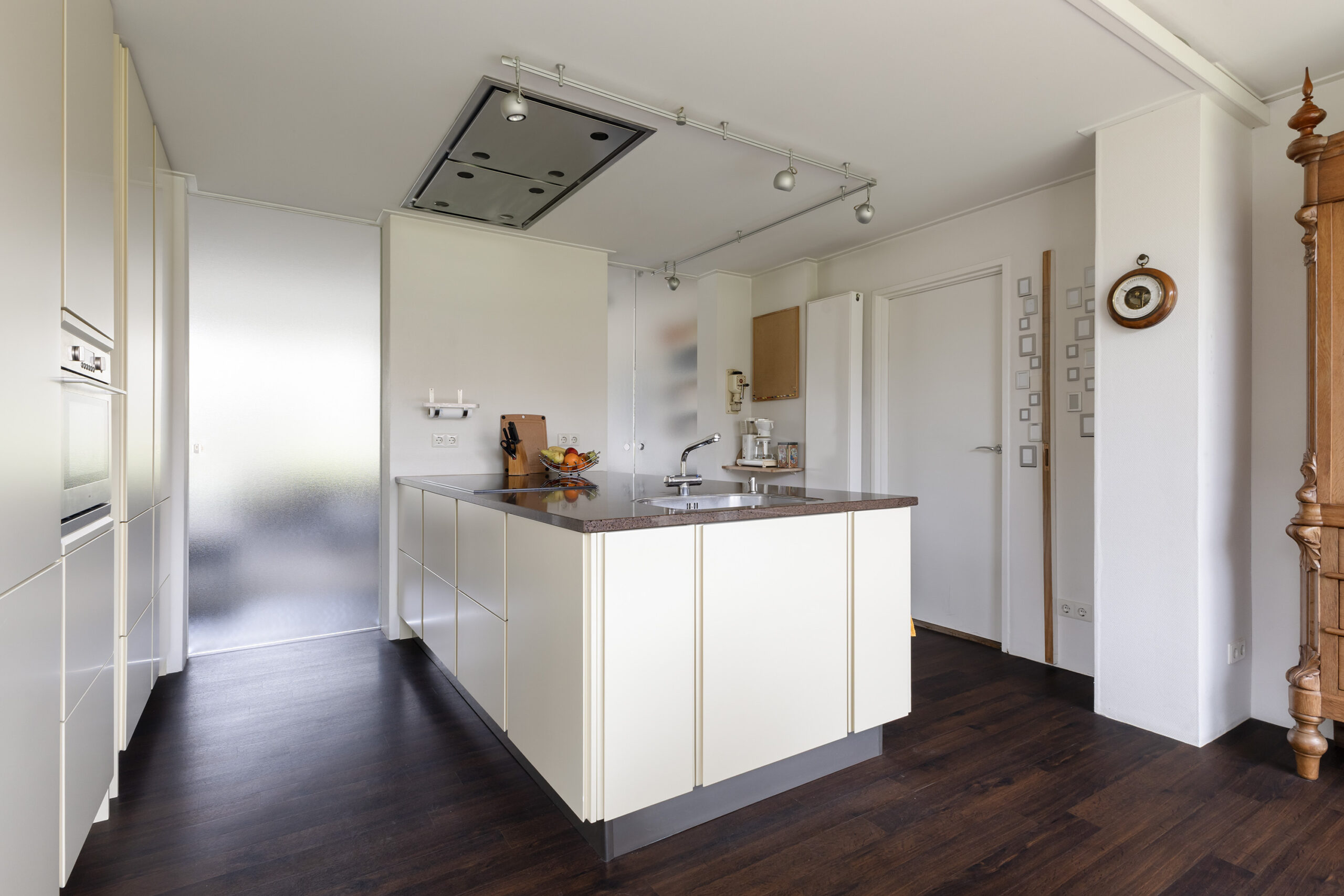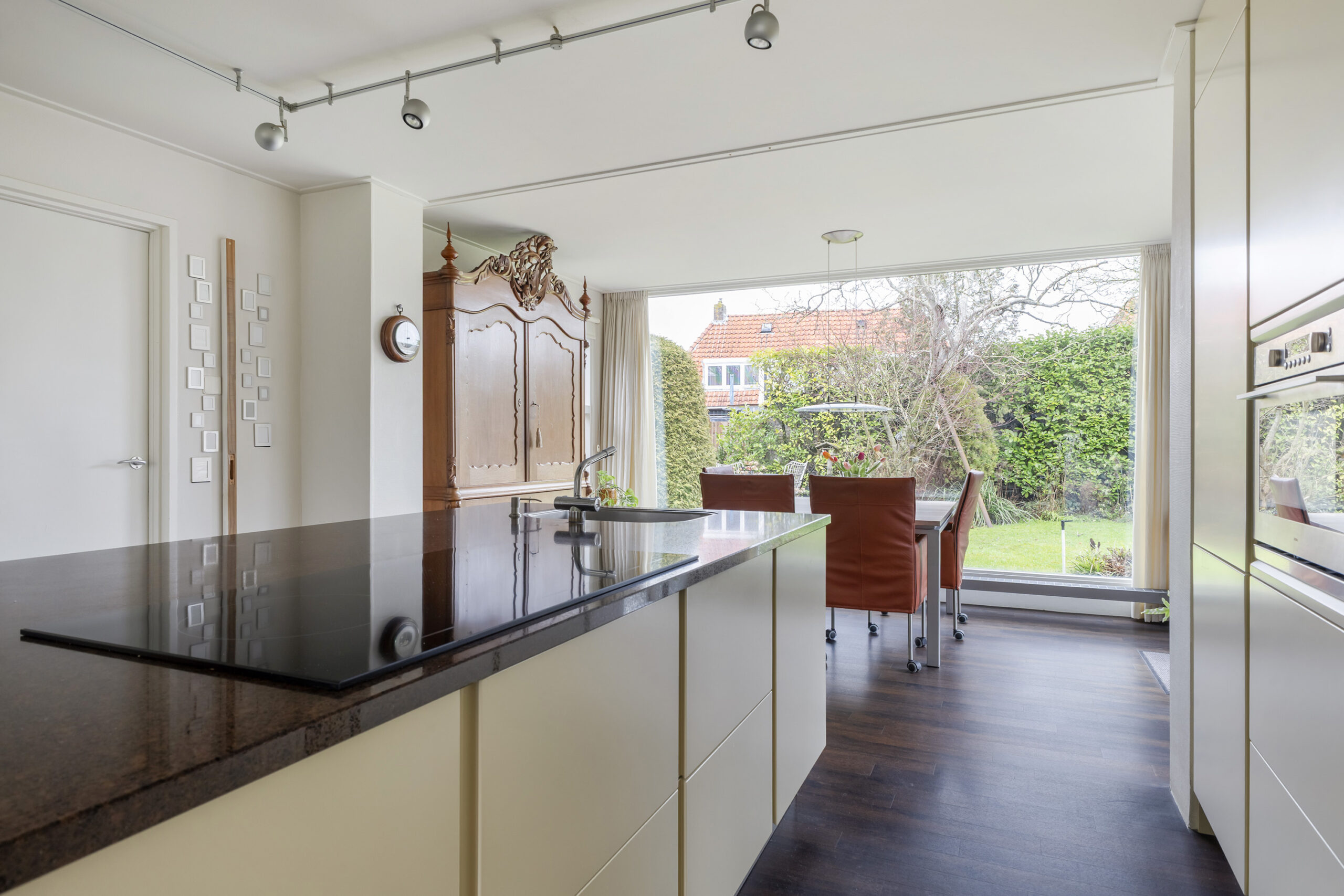 – keuken met royaal kook- en spoeleiland, voorzien van een inductiekookplaat en vaatwasser, en een hoge kastenwand met combi-oven