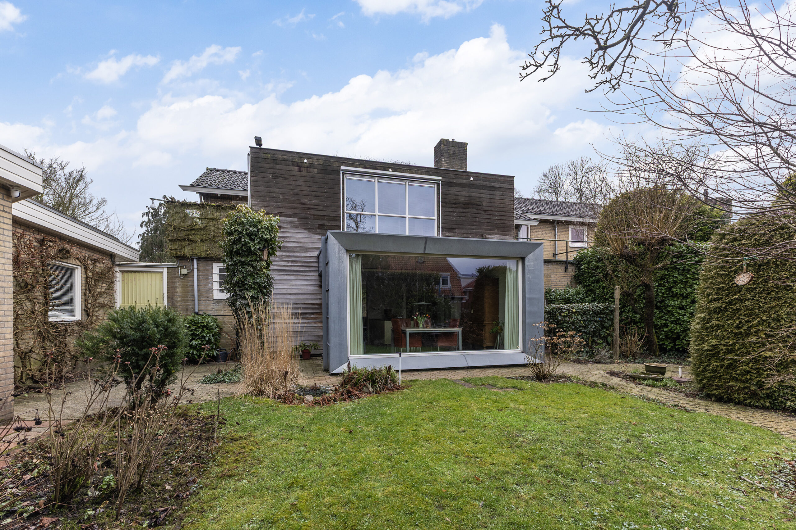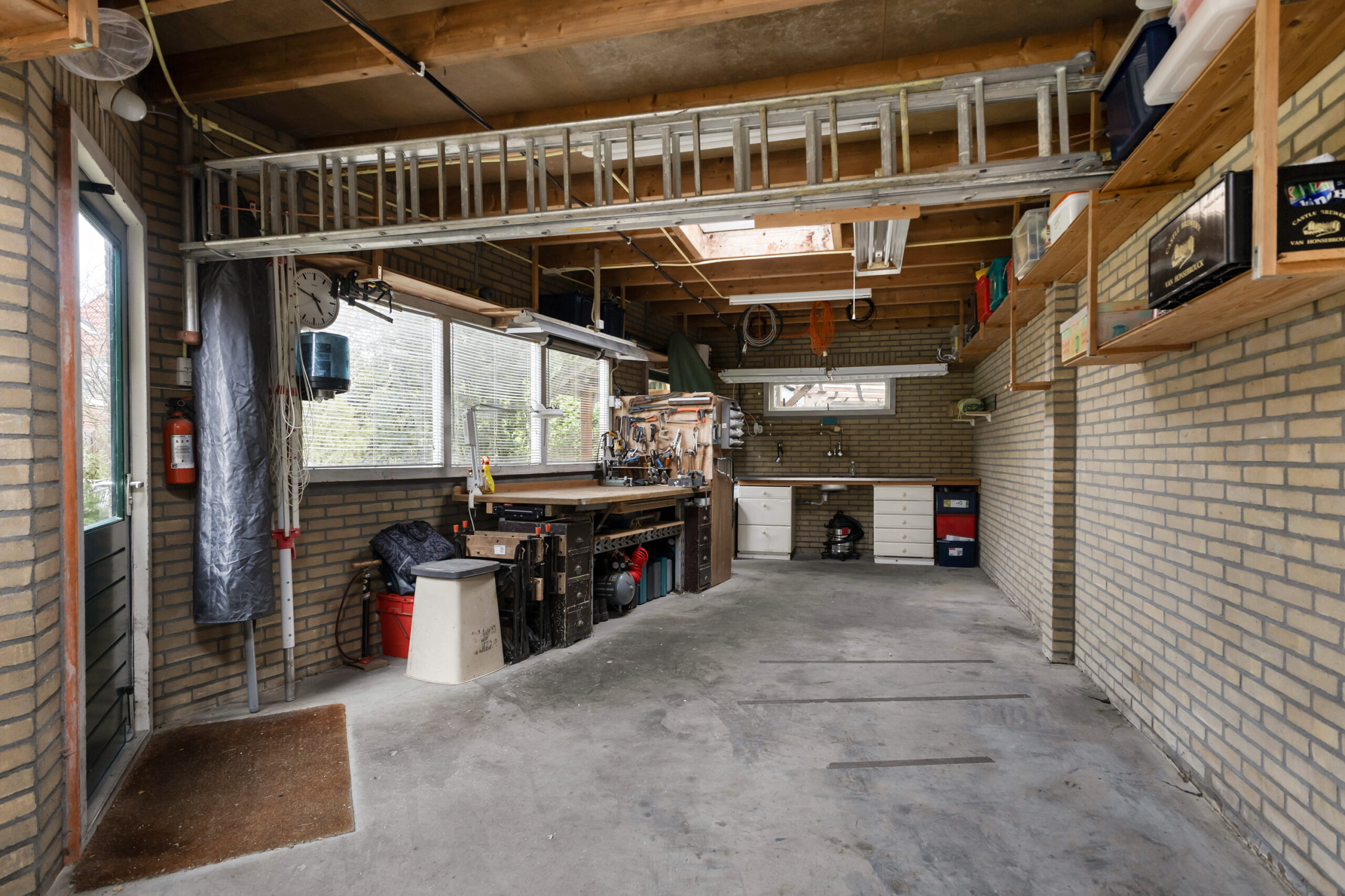 – zeer royale garage met kanteldeur, grote raampartijen, twee toegangsdeuren naar de achtertuin en een close-in boiler voor warm en koud water