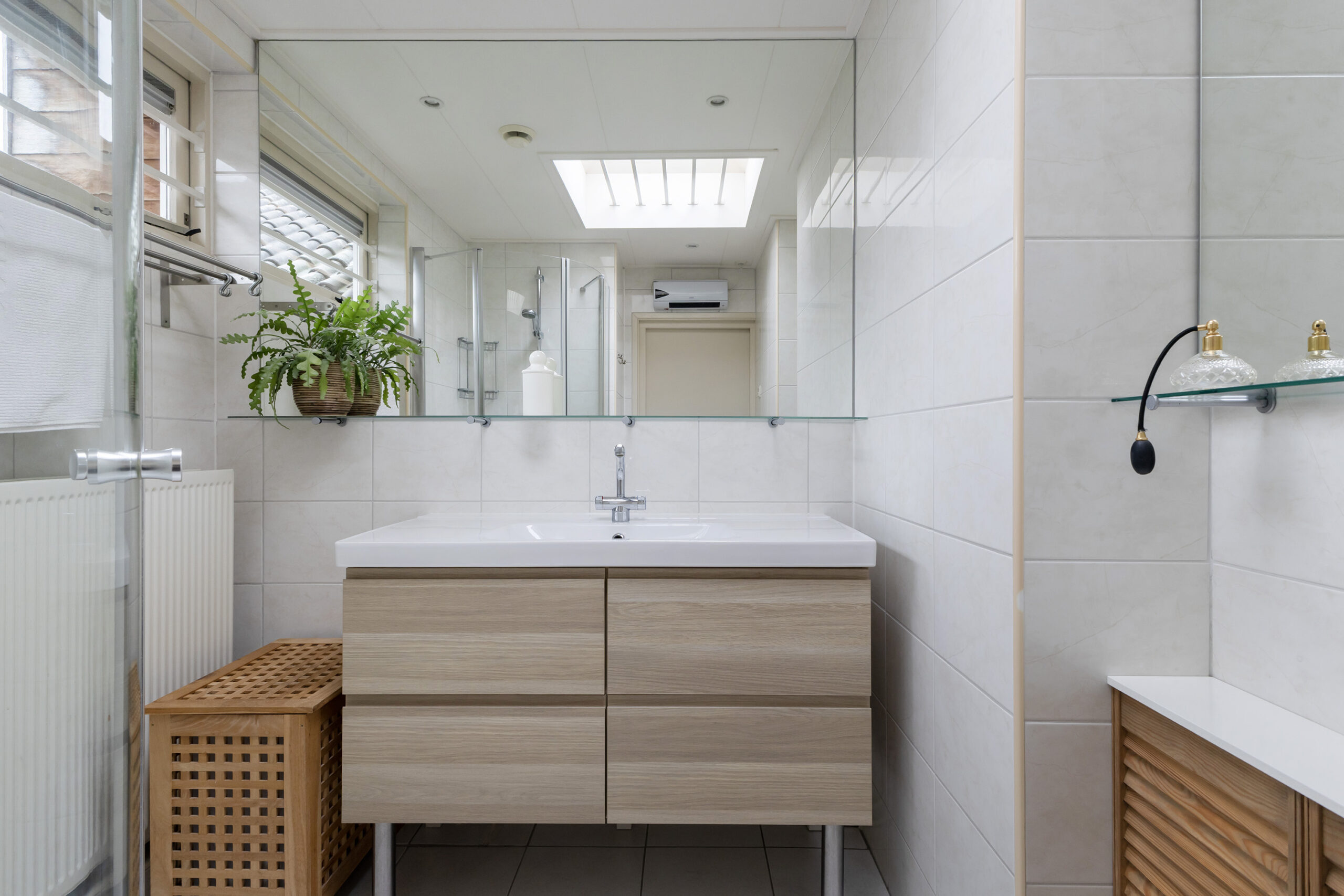 – badkamer met douchecabine, wastafel met meubel en een daklicht in het plafond