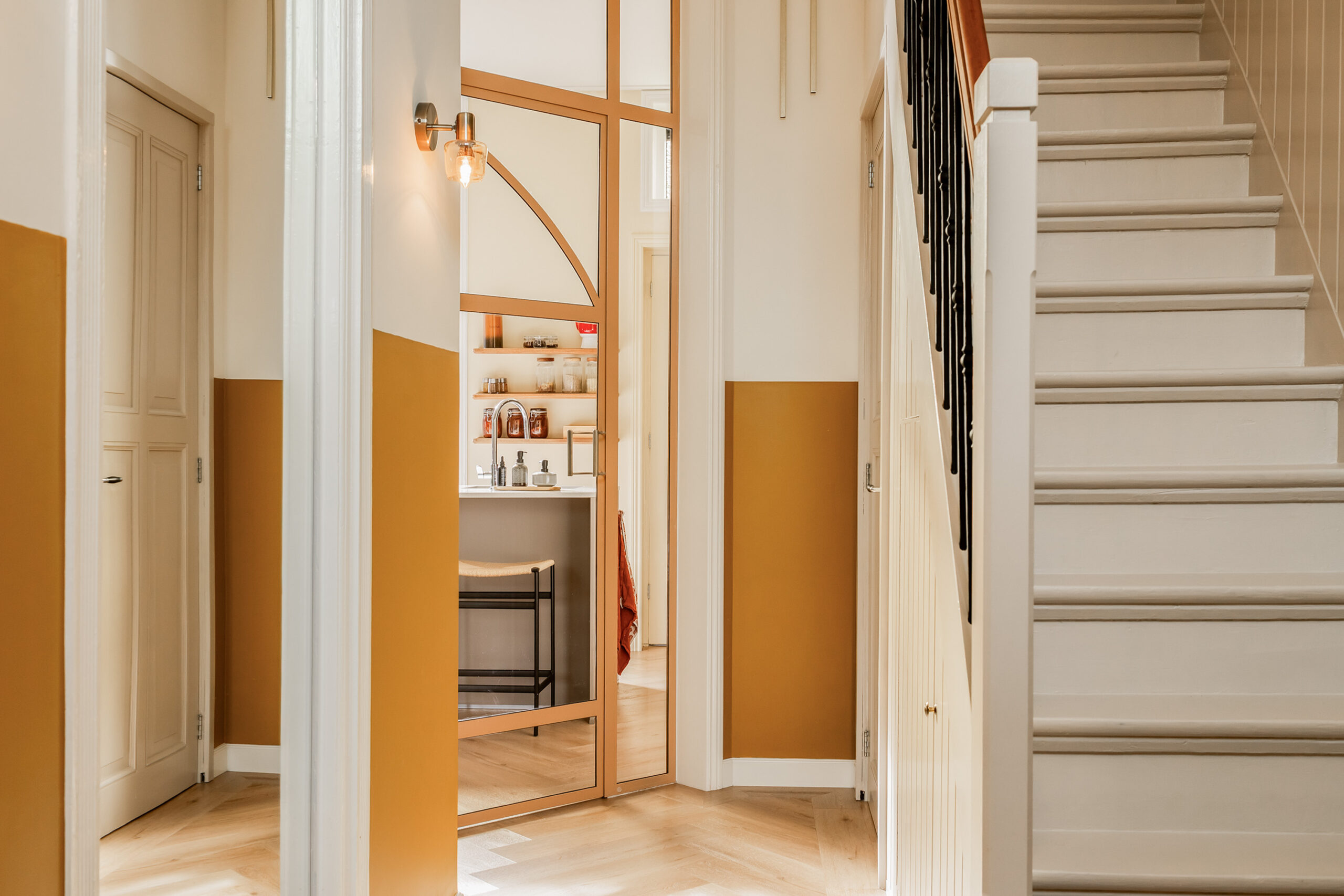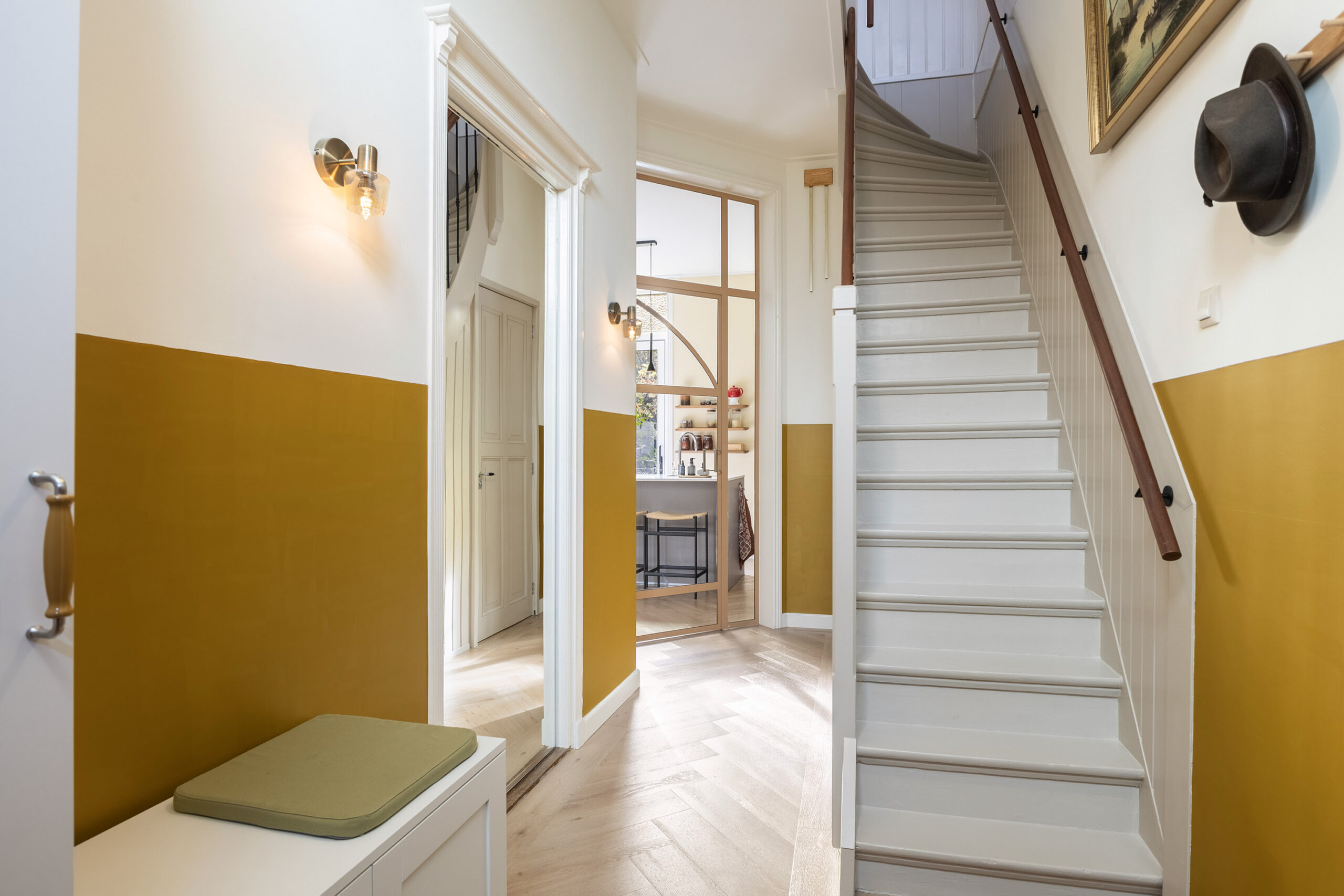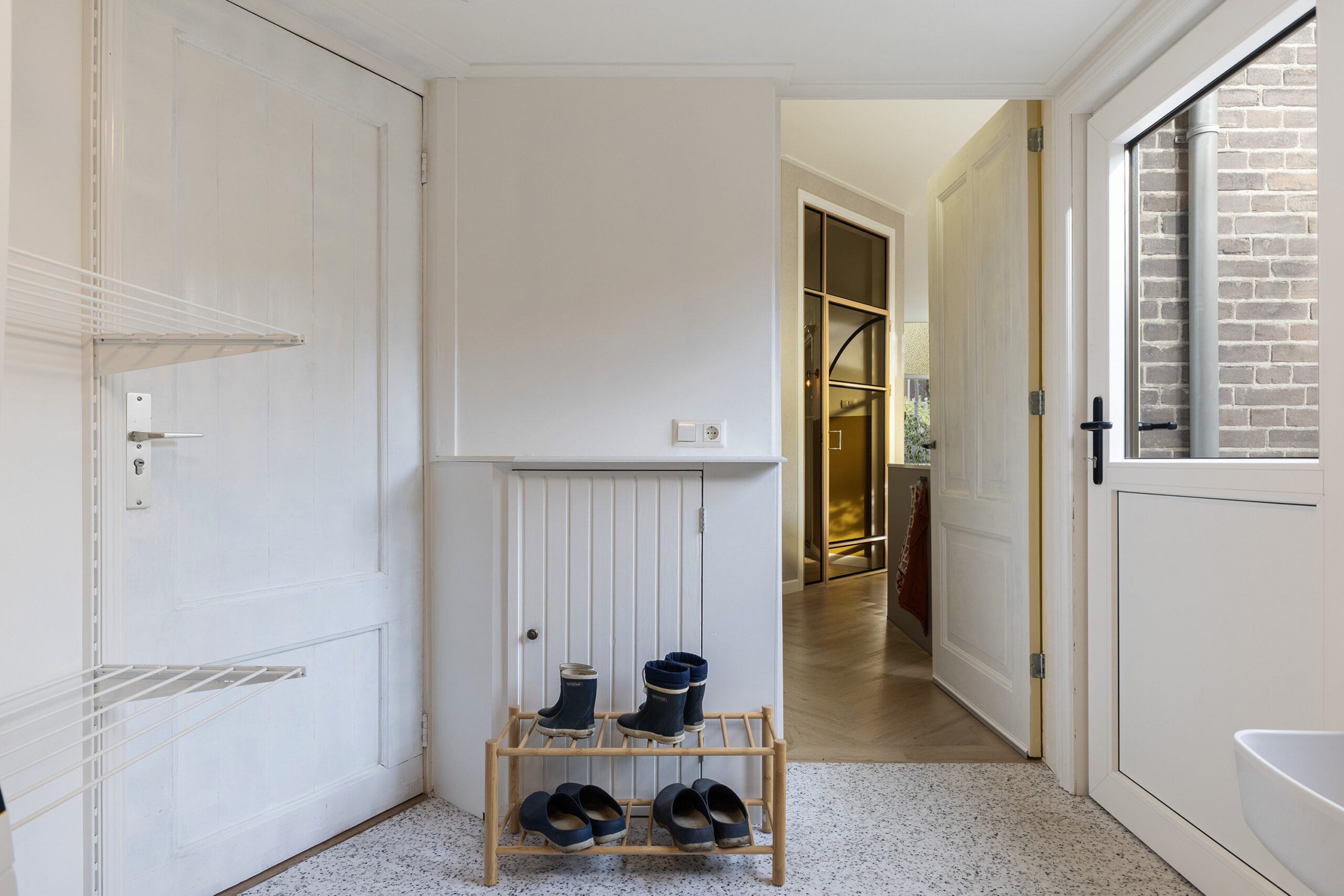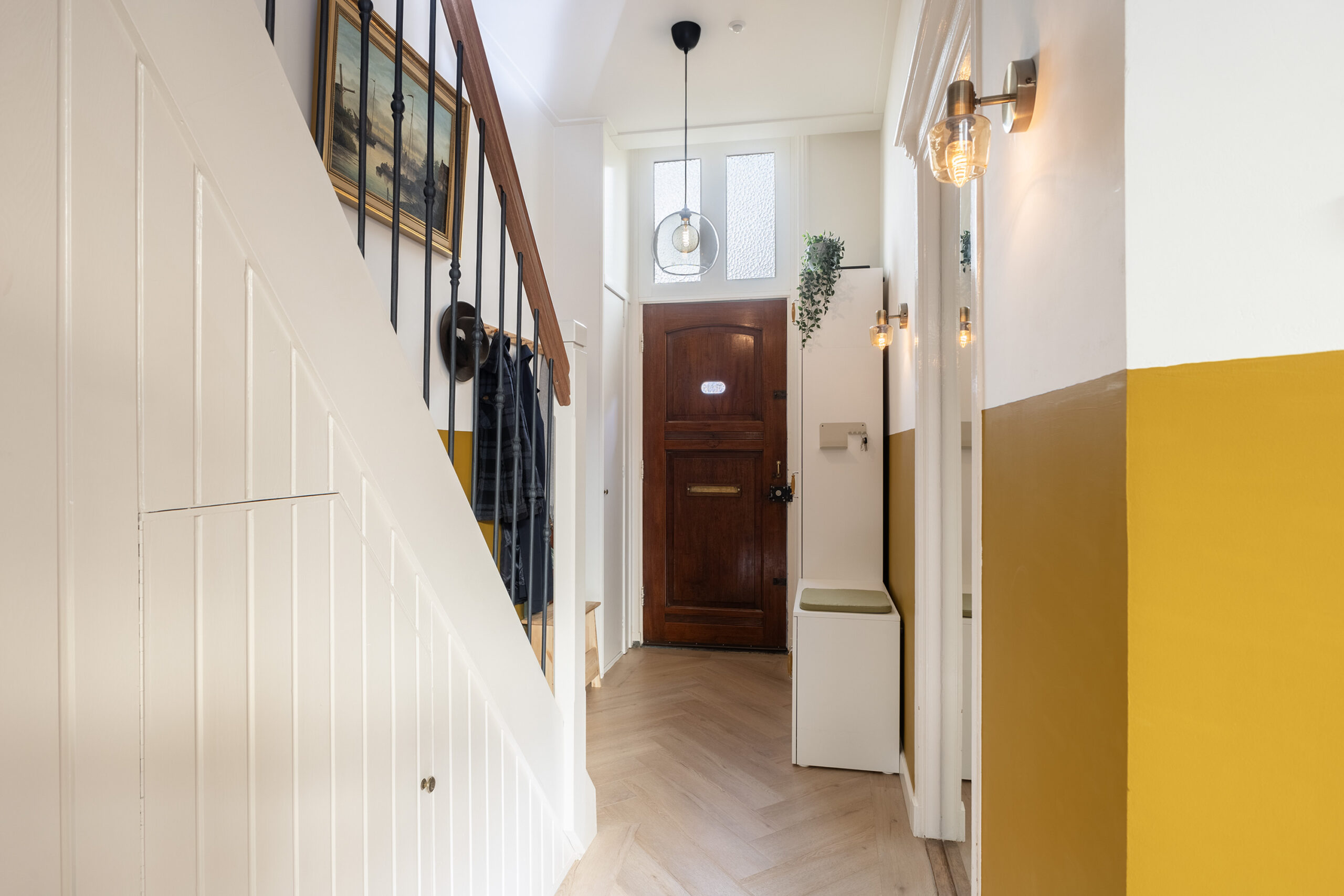 Entree in de ruime hal met de trap opgang en het moderne toilet. Rechts van de entree is een overdekte steeg welke gezamenlijk is met de buren aan de rechterkant. De woonkamer heeft een sfeervolle erker aan de straatzijde en aan de achterzijde, in de keuken, is er een schuifpui naar de achtertuin.
