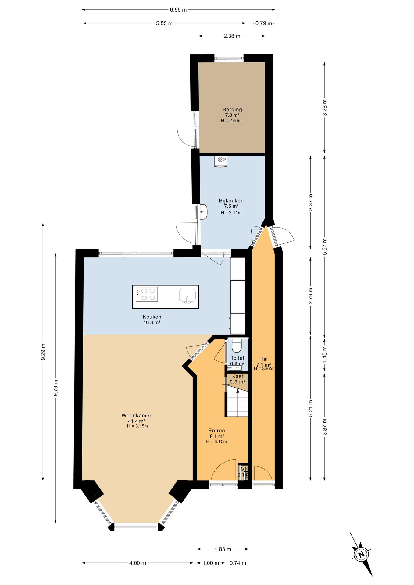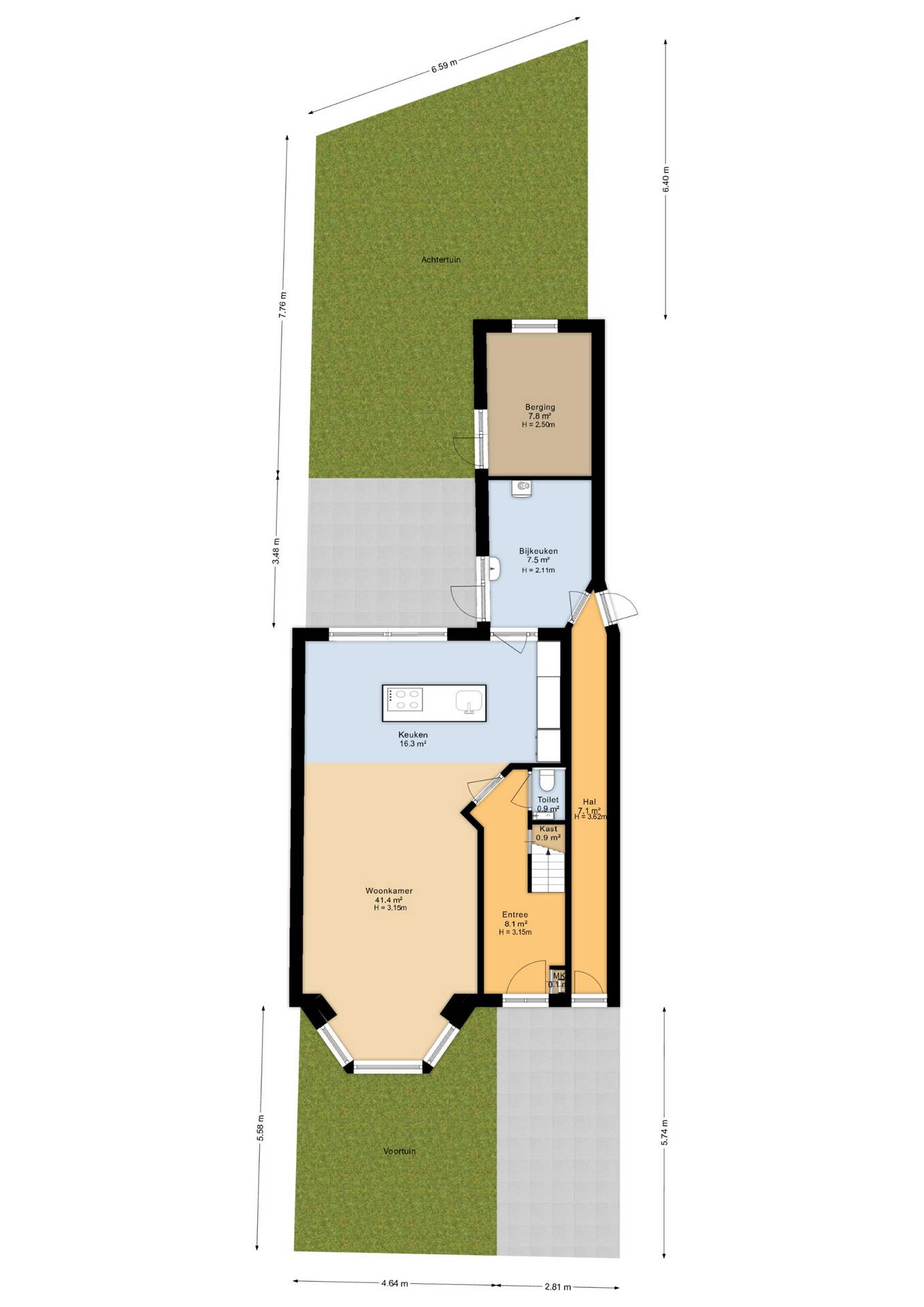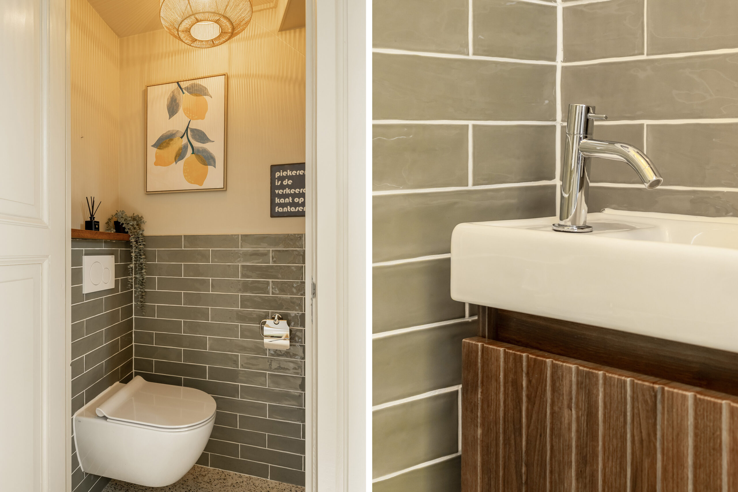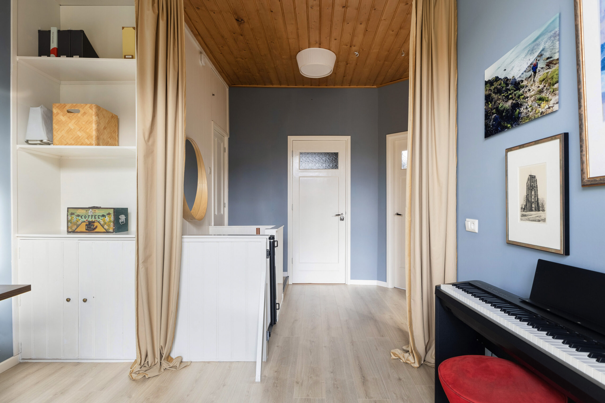 Entree in de ruime hal met de trap opgang en het moderne toilet. Rechts van de entree is een overdekte steeg welke gezamenlijk is met de buren aan de rechterkant. De woonkamer heeft een sfeervolle erker aan de straatzijde en aan de achterzijde, in de keuken, is er een schuifpui naar de achtertuin.