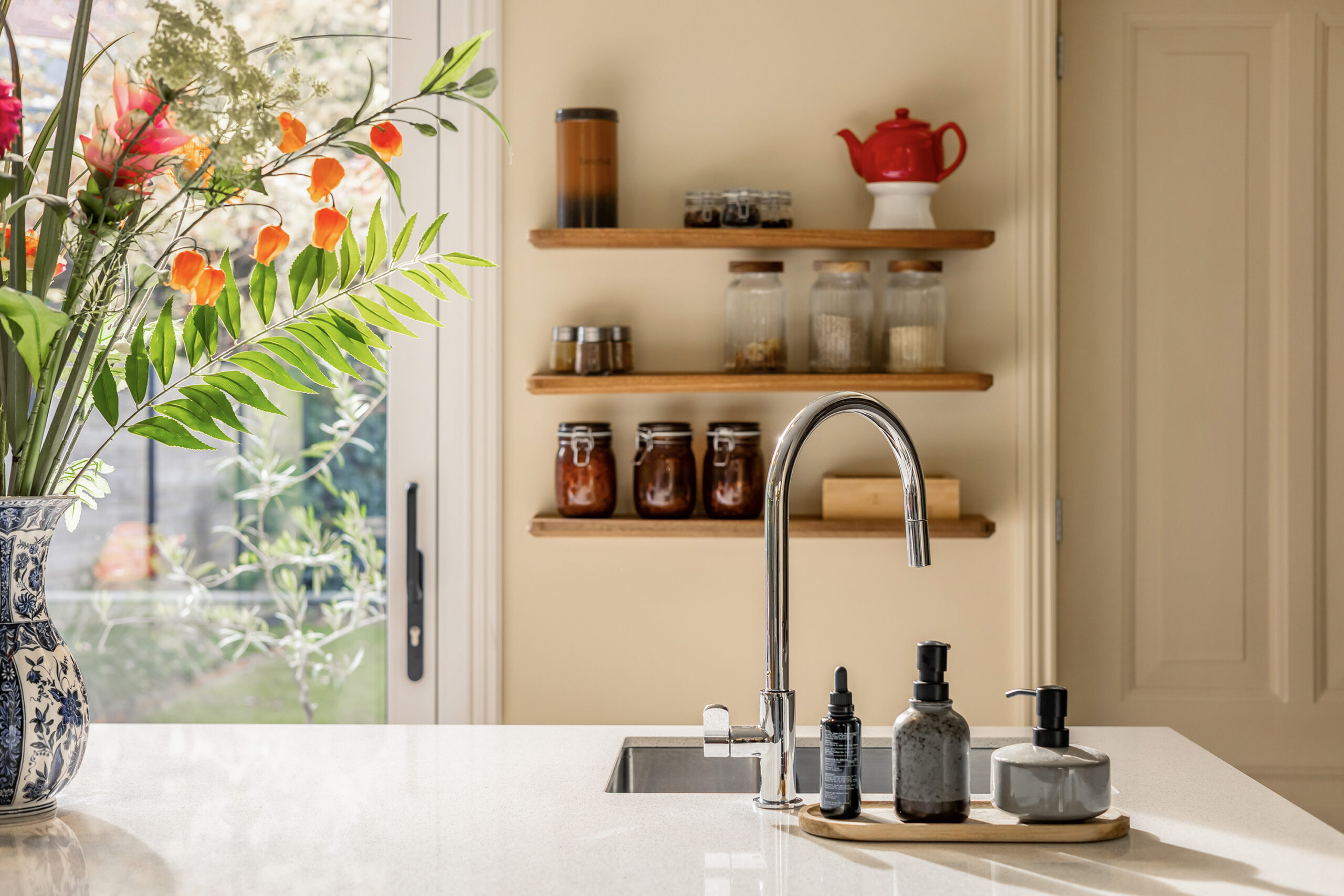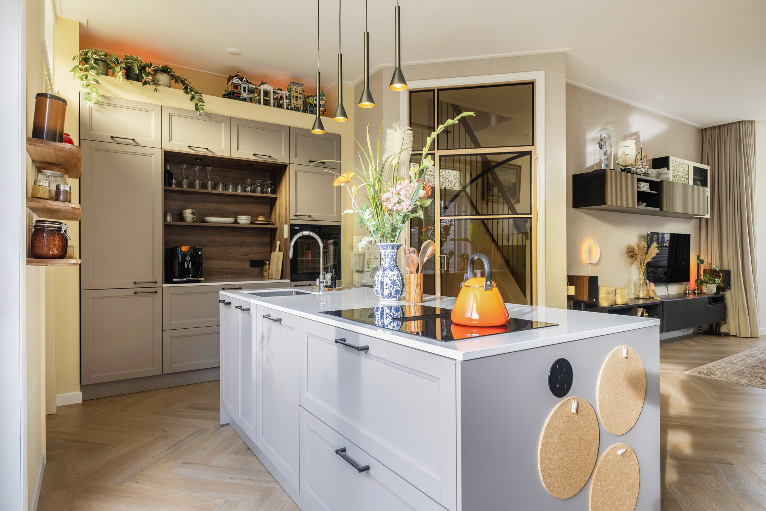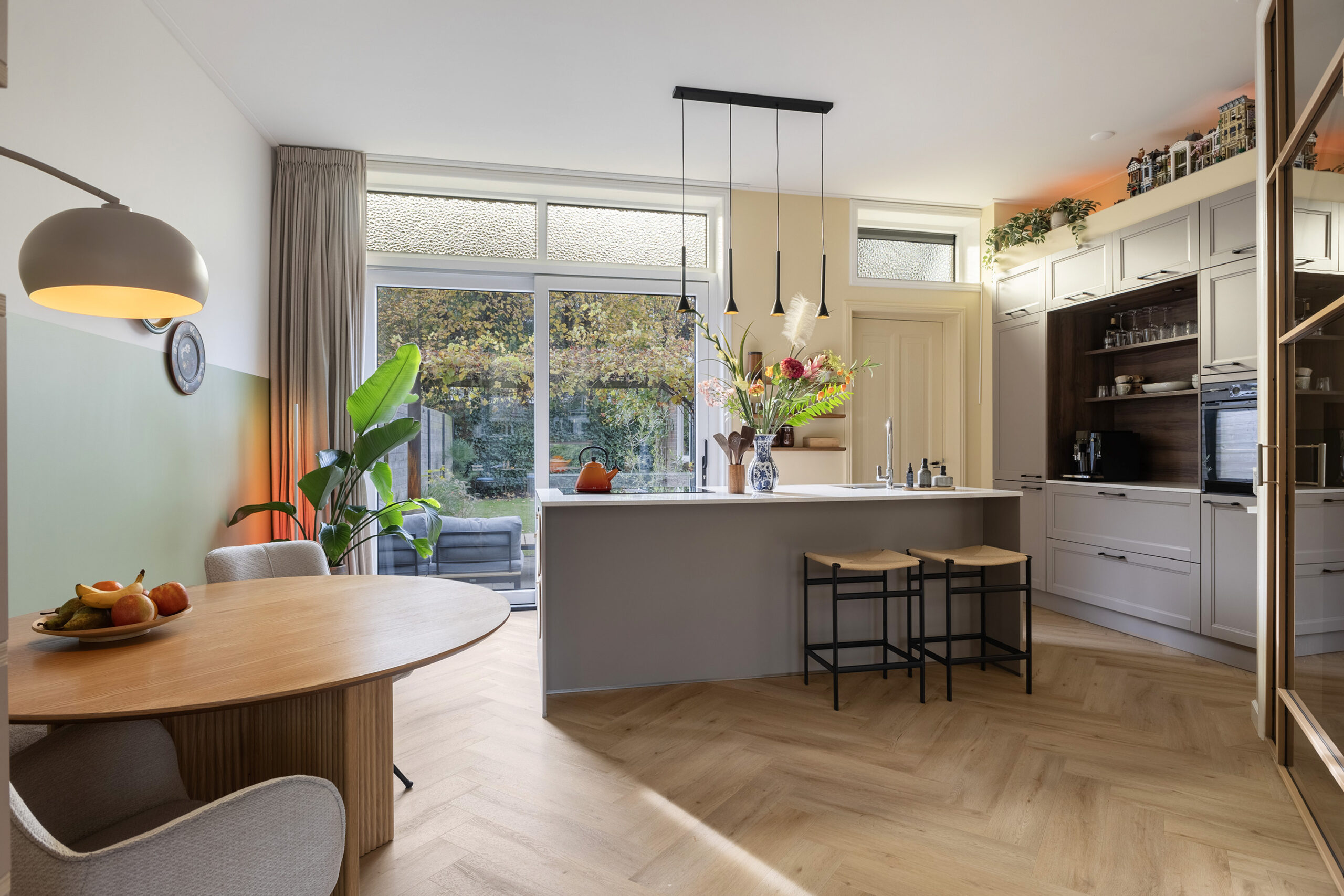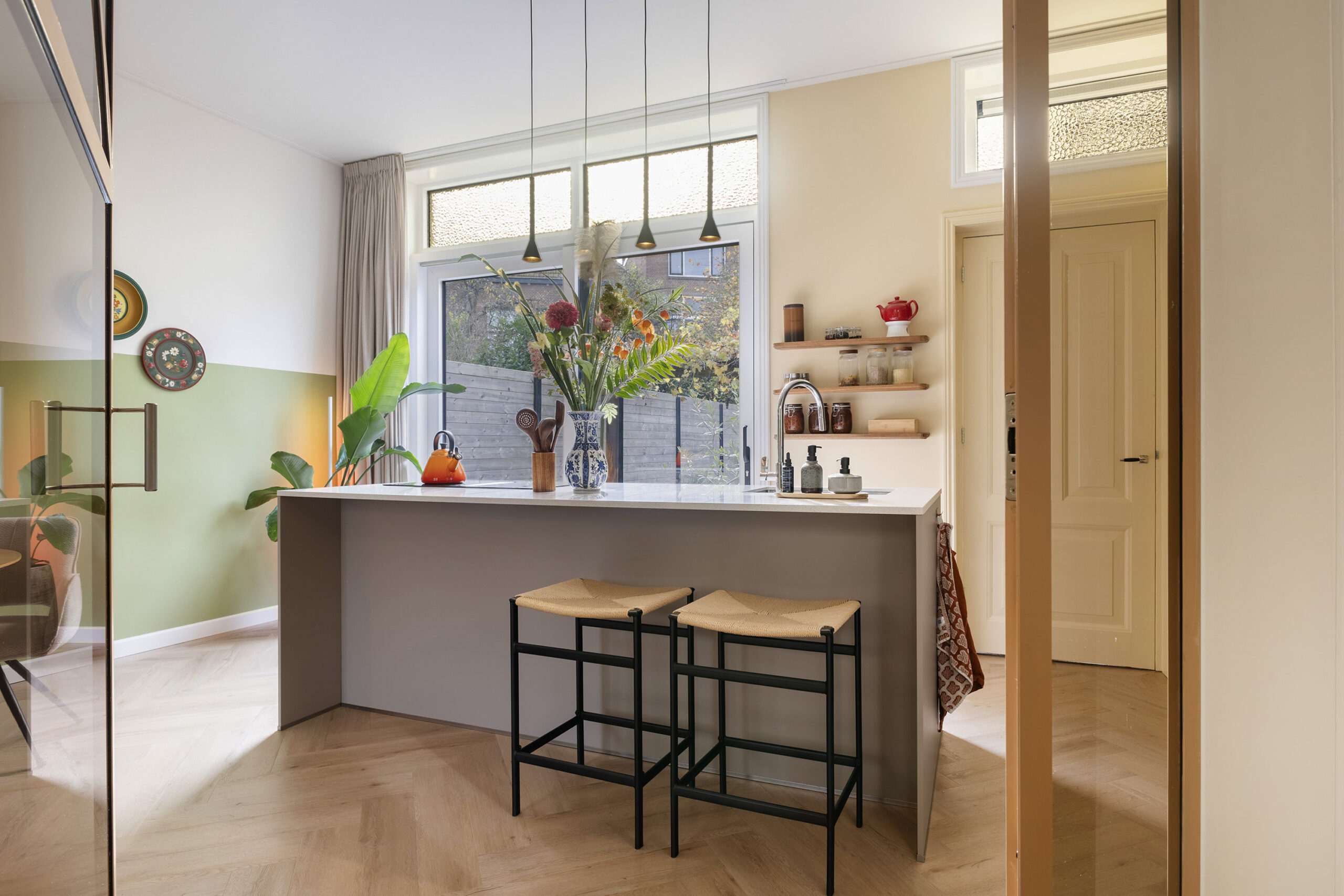 De moderne open keuken uit 2024, voorzien van een kook- en spoeleiland ligt aan de achterzijde en beschikt over een inductiekookplaat, oven, koel-vriescombinatie, vaatwasser en een elektrische boiler voor direct warm water. Vanuit de keuken is er een doorloop naar de bijkeuken, welke ook via de gezamenlijke steeg toegankelijk is. Achter de bijkeuken bevindt zich een aangebouwde stenen berging.